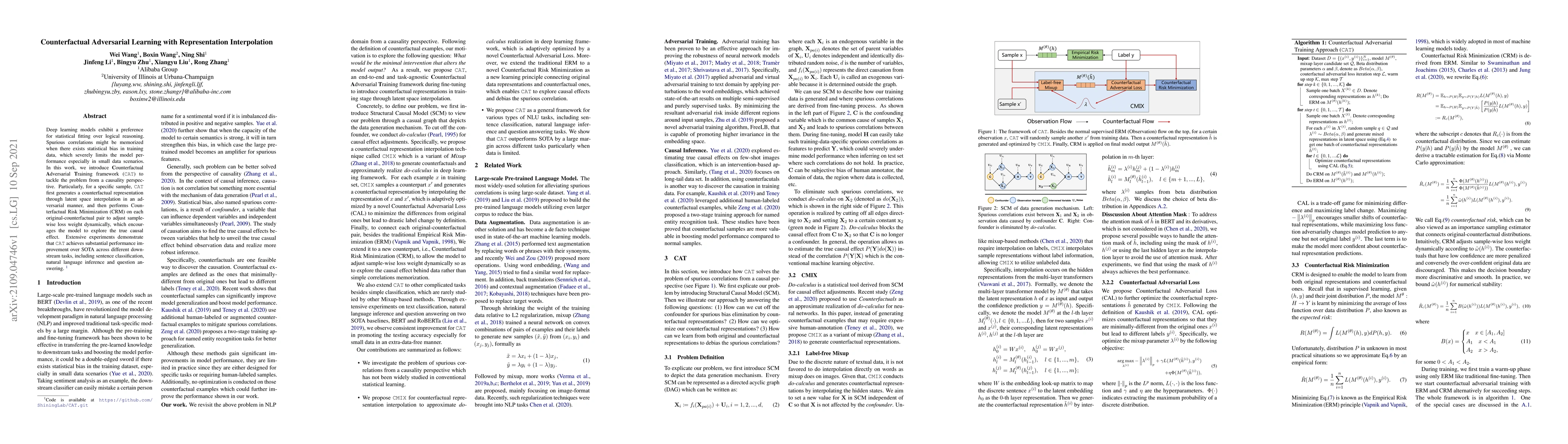 Deep learning models exhibit a preference for statistical fitting over logical reasoning. Spurious correlations might be memorized when there exists statistical bias in training data, which severely limits the model performance especially in small data scenarios. In this work, we introduce Counterfactual Adversarial Training framework (CAT) to tackle the problem from a causality perspective. Particularly, for a specific sample, CAT first generates a counterfactual representation through latent space interpolation in an adversarial manner, and then performs Counterfactual Risk Minimization (CRM) on each original-counterfactual pair to adjust sample-wise loss weight dynamically, which encourages the model to explore the true causal effect. Extensive experiments demonstrate that CAT achieves substantial performance improvement over SOTA across different downstream tasks, including sentence classification, natural language inference and question answering.