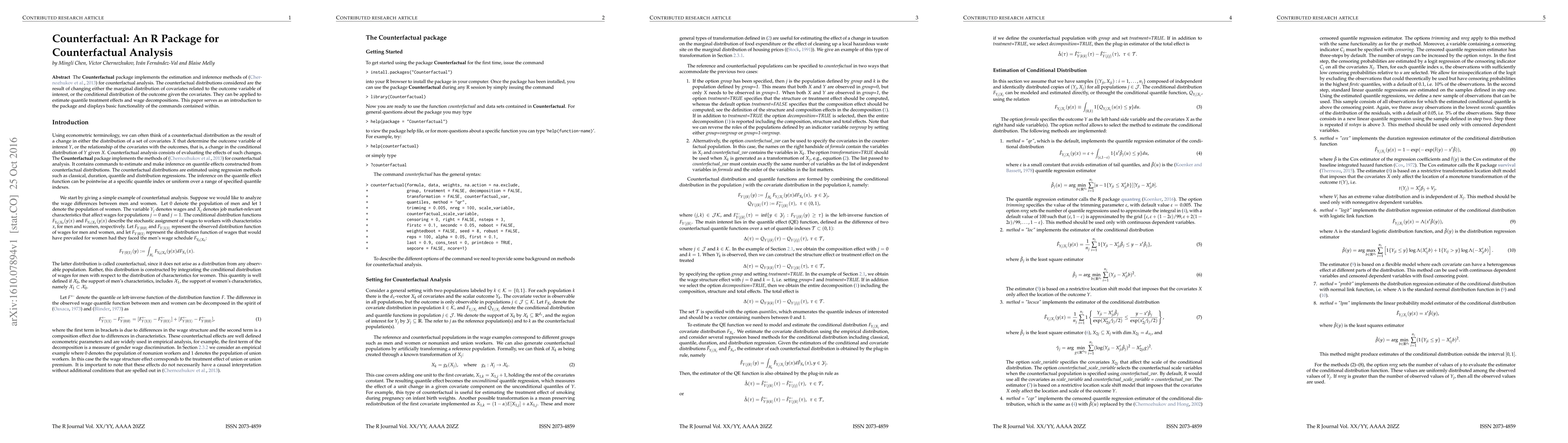 The Counterfactual package implements the estimation and inference methods of Chernozhukov, Fern\'andez-Val and Melly (2013) for counterfactual analysis. The counterfactual distributions considered are the result of changing either the marginal distribution of covariates related to the outcome variable of interest, or the conditional distribution of the outcome given the covariates. They can be applied to estimate quantile treatment effects and wage decompositions. This paper serves as an introduction to the package and displays basic functionality of the commands contained within.