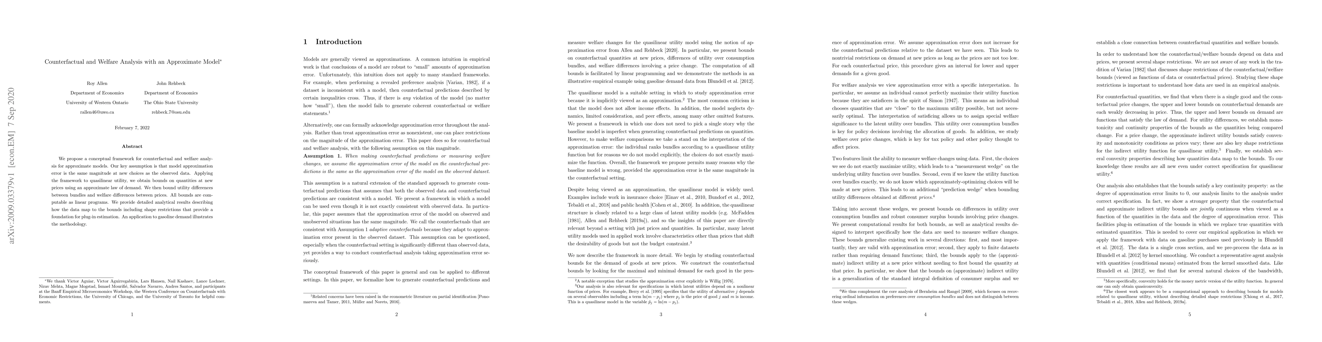 This paper proposes a framework for counterfactual and welfare analysis using approximate models, assuming consistent approximation error. It applies this framework to quasilinear utility, deriving computable bounds on utility and welfare differences using an approximate law of demand, illustrated with an application to gasoline demand.