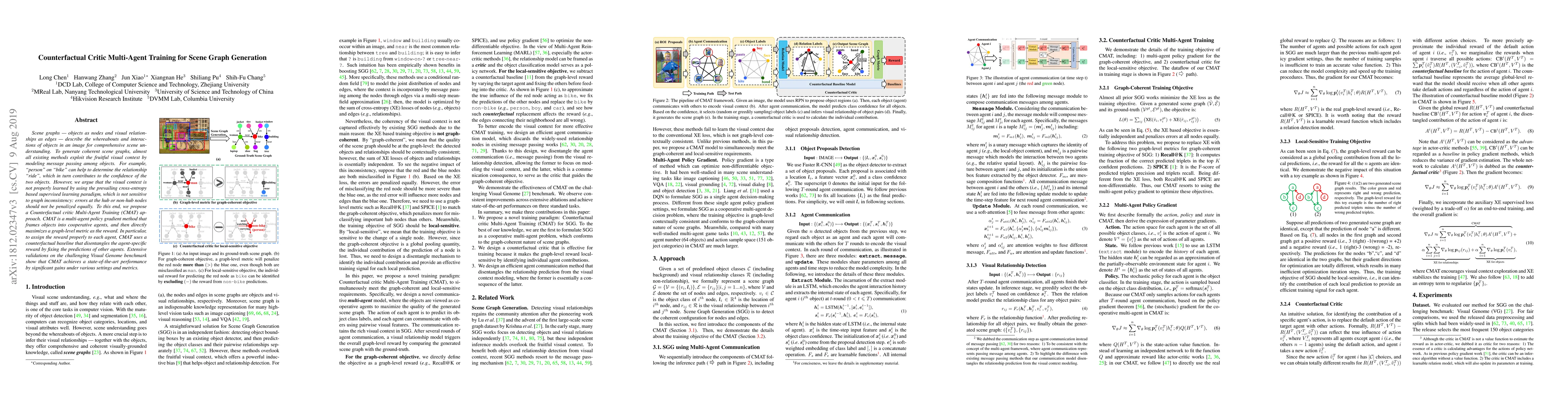 The paper proposes a Counterfactual Critic Multi-Agent Training (CMAT) approach to improve scene graph generation, addressing the limitations of existing cross-entropy methods. CMAT leverages a multi-agent policy gradient method to maximize a graph-level metric, using a counterfactual baseline to fairly assign rewards to each agent, leading to state-of-the-art performance on the Visual Genome benchmark.