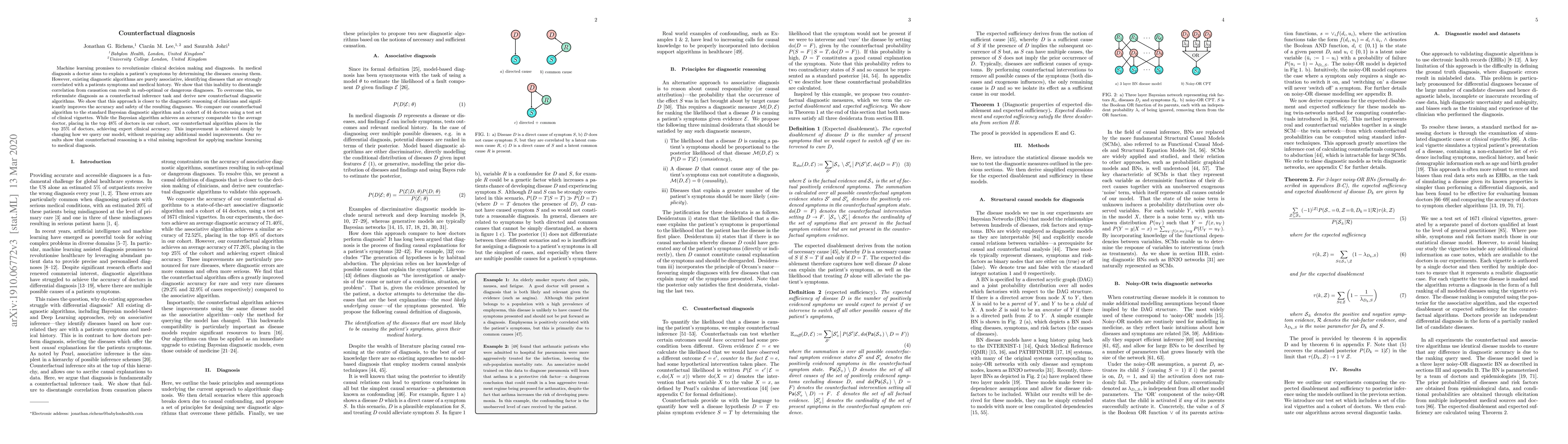 Machine learning promises to revolutionize clinical decision making and diagnosis. In medical diagnosis a doctor aims to explain a patient's symptoms by determining the diseases \emph{causing} them. However, existing diagnostic algorithms are purely associative, identifying diseases that are strongly correlated with a patients symptoms and medical history. We show that this inability to disentangle correlation from causation can result in sub-optimal or dangerous diagnoses. To overcome this, we reformulate diagnosis as a counterfactual inference task and derive new counterfactual diagnostic algorithms. We show that this approach is closer to the diagnostic reasoning of clinicians and significantly improves the accuracy and safety of the resulting diagnoses. We compare our counterfactual algorithm to the standard Bayesian diagnostic algorithm and a cohort of 44 doctors using a test set of clinical vignettes. While the Bayesian algorithm achieves an accuracy comparable to the average doctor, placing in the top 48% of doctors in our cohort, our counterfactual algorithm places in the top 25% of doctors, achieving expert clinical accuracy. This improvement is achieved simply by changing how we query our model, without requiring any additional model improvements. Our results show that counterfactual reasoning is a vital missing ingredient for applying machine learning to medical diagnosis.