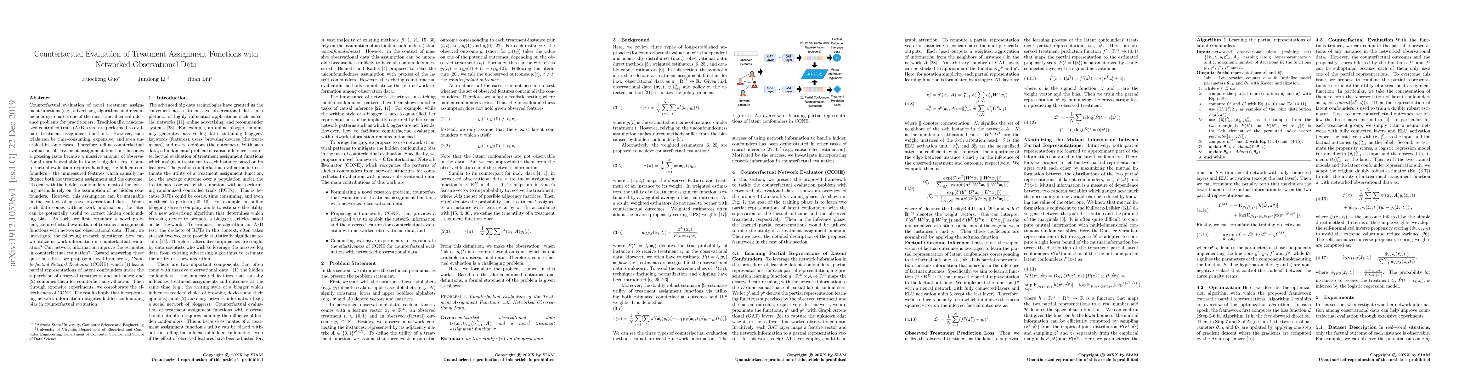 This paper proposes a novel framework, CONE, for counterfactual evaluation of treatment assignment functions using networked observational data to address hidden confounders. The framework learns latent confounders and leverages network information to improve counterfactual estimates, demonstrating effectiveness in mitigating hidden confounding bias.