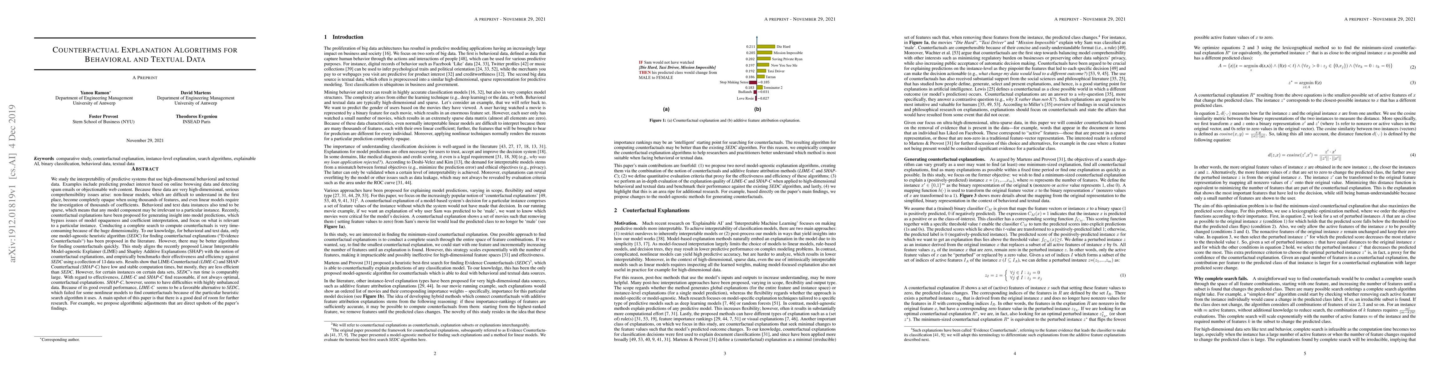 Two popular machine learning explainability algorithms, LIME-Counterfactual and SHAP-Counterfactual, were compared to a model-agnostic heuristic algorithm SEDC for finding counterfactual explanations in high-dimensional behavioral and textual data. While they have lower computation times, LIME-Counterfactual is a more efficient alternative to SEDC for many instances.