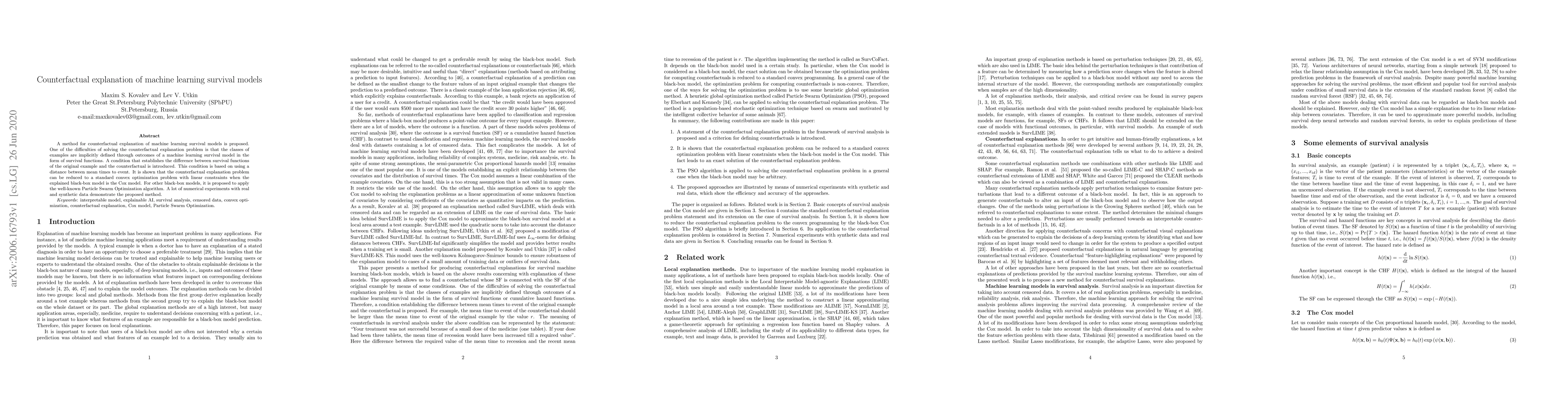 The paper proposes a method for generating counterfactual explanations for machine learning survival models, reducing the counterfactual explanation problem to a convex optimization problem for the Cox model and using Particle Swarm Optimization (PSO) for other black-box models.