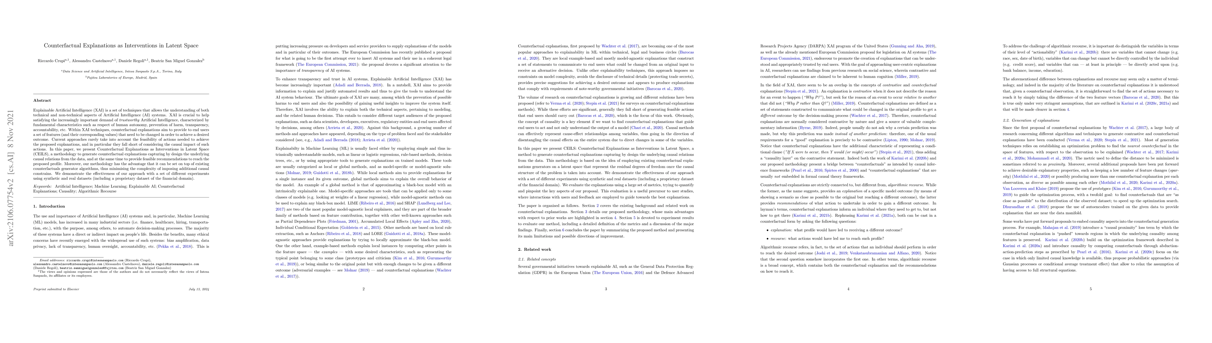 Explainable Artificial Intelligence (XAI) is a set of techniques that allows the understanding of both technical and non-technical aspects of Artificial Intelligence (AI) systems. XAI is crucial to help satisfying the increasingly important demand of \emph{trustworthy} Artificial Intelligence, characterized by fundamental characteristics such as respect of human autonomy, prevention of harm, transparency, accountability, etc. Within XAI techniques, counterfactual explanations aim to provide to end users a set of features (and their corresponding values) that need to be changed in order to achieve a desired outcome. Current approaches rarely take into account the feasibility of actions needed to achieve the proposed explanations, and in particular they fall short of considering the causal impact of such actions. In this paper, we present Counterfactual Explanations as Interventions in Latent Space (CEILS), a methodology to generate counterfactual explanations capturing by design the underlying causal relations from the data, and at the same time to provide feasible recommendations to reach the proposed profile. Moreover, our methodology has the advantage that it can be set on top of existing counterfactuals generator algorithms, thus minimising the complexity of imposing additional causal constrains. We demonstrate the effectiveness of our approach with a set of different experiments using synthetic and real datasets (including a proprietary dataset of the financial domain).