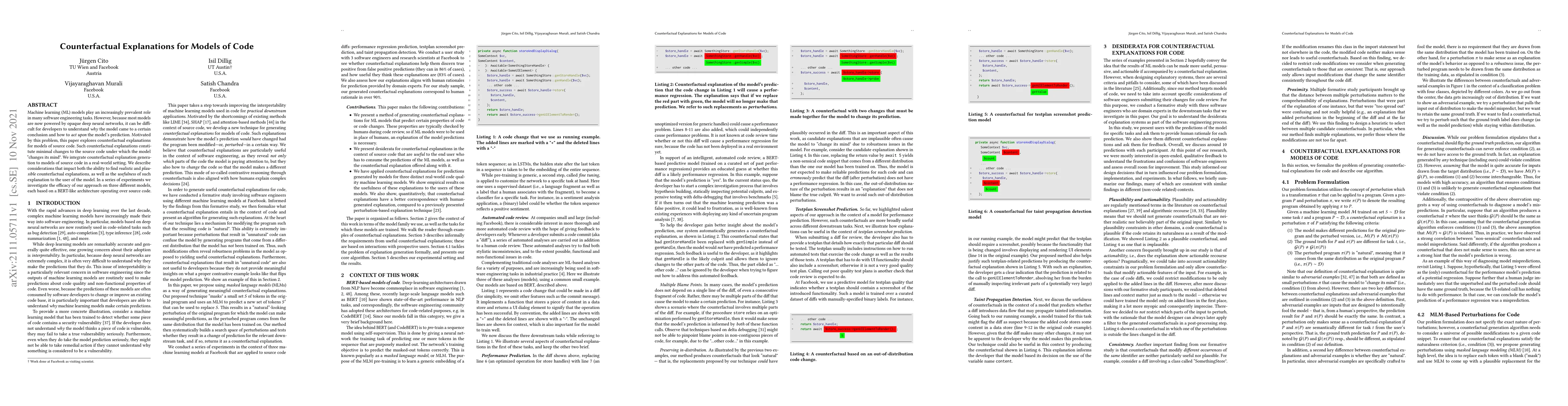 This paper explores counterfactual explanations for models of source code, providing a way to understand why a model predicts a certain outcome and how it can be improved. The authors test their approach on three BERT-like models, finding it to be effective in generating realistic and plausible explanations.