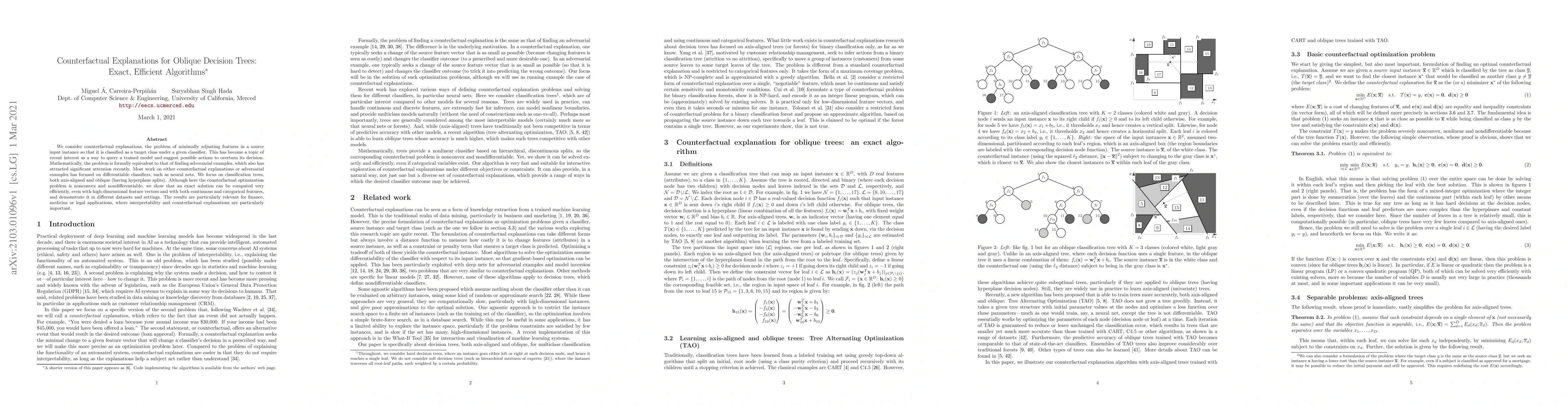 This paper presents efficient algorithms for generating counterfactual explanations for oblique decision trees, enabling minimal adjustments to input features to change a model's classification. Despite the nonconvex nature of the problem, the proposed methods achieve exact solutions efficiently, making them applicable to high-dimensional, mixed-type feature datasets, and highlighting their relevance for interpretable applications in finance, medicine, and law.