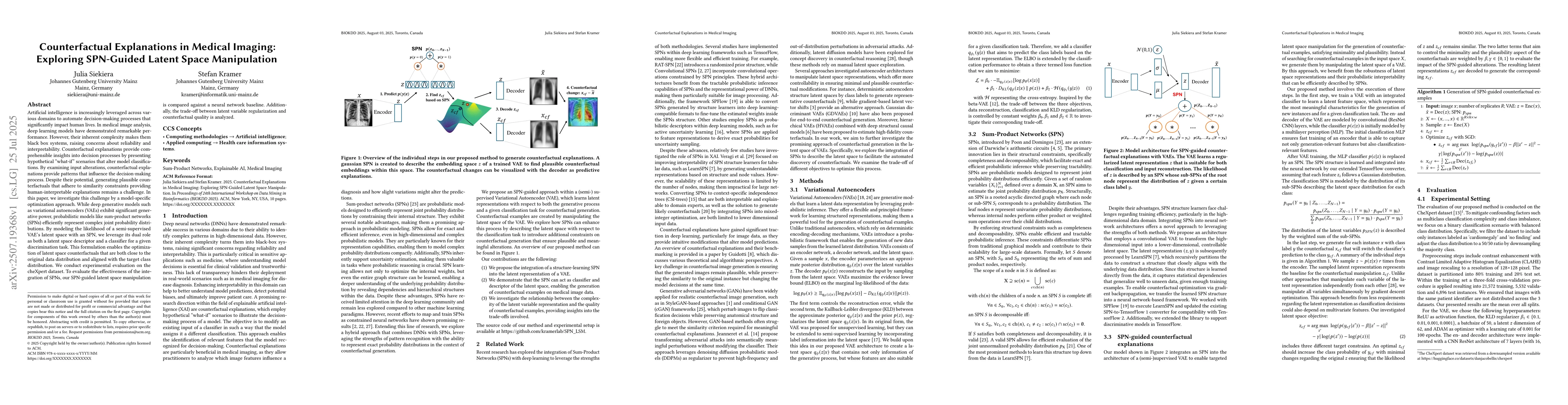 Artificial intelligence is increasingly leveraged across various domains to automate decision-making processes that significantly impact human lives. In medical image analysis, deep learning models have demonstrated remarkable performance. However, their inherent complexity makes them black box systems, raising concerns about reliability and interpretability. Counterfactual explanations provide comprehensible insights into decision processes by presenting hypothetical "what-if" scenarios that alter model classifications. By examining input alterations, counterfactual explanations provide patterns that influence the decision-making process. Despite their potential, generating plausible counterfactuals that adhere to similarity constraints providing human-interpretable explanations remains a challenge. In this paper, we investigate this challenge by a model-specific optimization approach. While deep generative models such as variational autoencoders (VAEs) exhibit significant generative power, probabilistic models like sum-product networks (SPNs) efficiently represent complex joint probability distributions. By modeling the likelihood of a semi-supervised VAE's latent space with an SPN, we leverage its dual role as both a latent space descriptor and a classifier for a given discrimination task. This formulation enables the optimization of latent space counterfactuals that are both close to the original data distribution and aligned with the target class distribution. We conduct experimental evaluation on the cheXpert dataset. To evaluate the effectiveness of the integration of SPNs, our SPN-guided latent space manipulation is compared against a neural network baseline. Additionally, the trade-off between latent variable regularization and counterfactual quality is analyzed.