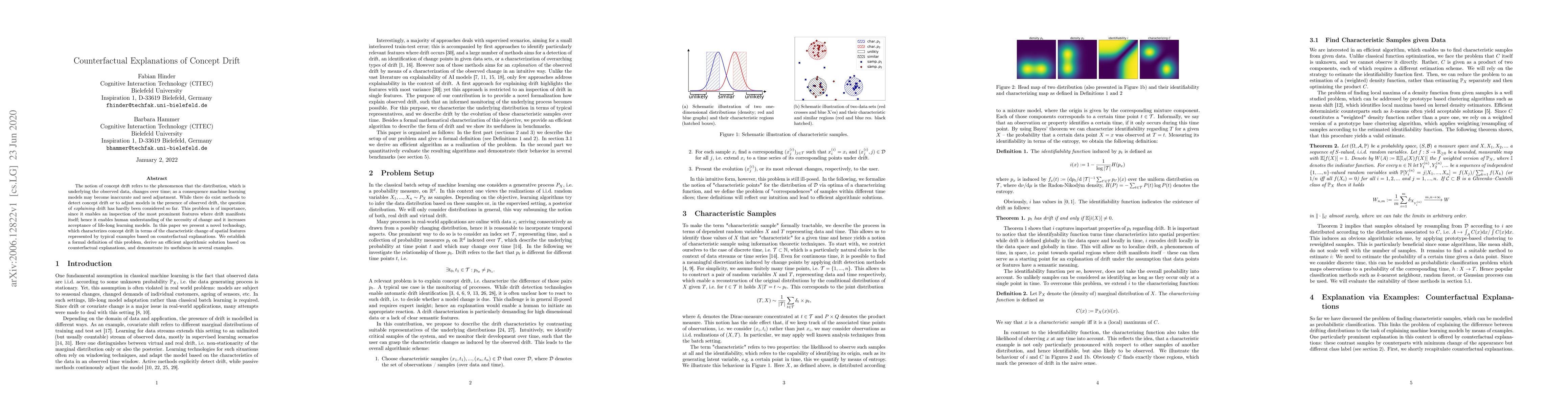 The notion of concept drift refers to the phenomenon that the distribution, which is underlying the observed data, changes over time; as a consequence machine learning models may become inaccurate and need adjustment. While there do exist methods to detect concept drift or to adjust models in the presence of observed drift, the question of explaining drift has hardly been considered so far. This problem is of importance, since it enables an inspection of the most prominent features where drift manifests itself; hence it enables human understanding of the necessity of change and it increases acceptance of life-long learning models. In this paper we present a novel technology, which characterizes concept drift in terms of the characteristic change of spatial features represented by typical examples based on counterfactual explanations. We establish a formal definition of this problem, derive an efficient algorithmic solution based on counterfactual explanations, and demonstrate its usefulness in several examples.