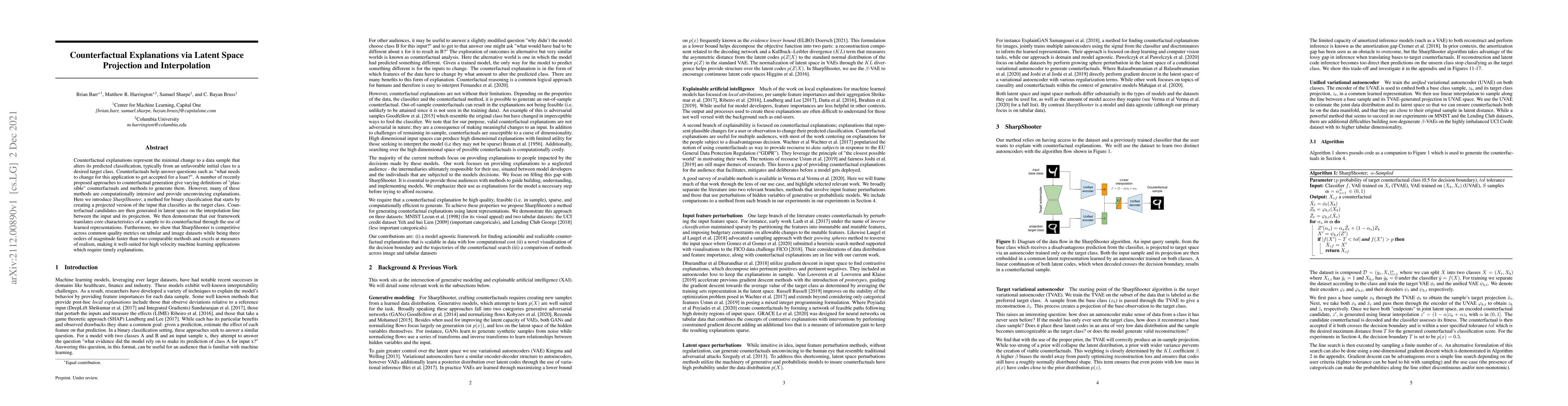 Counterfactual explanations represent the minimal change to a data sample that alters its predicted classification, typically from an unfavorable initial class to a desired target class. Counterfactuals help answer questions such as "what needs to change for this application to get accepted for a loan?". A number of recently proposed approaches to counterfactual generation give varying definitions of "plausible" counterfactuals and methods to generate them. However, many of these methods are computationally intensive and provide unconvincing explanations. Here we introduce SharpShooter, a method for binary classification that starts by creating a projected version of the input that classifies as the target class. Counterfactual candidates are then generated in latent space on the interpolation line between the input and its projection. We then demonstrate that our framework translates core characteristics of a sample to its counterfactual through the use of learned representations. Furthermore, we show that SharpShooter is competitive across common quality metrics on tabular and image datasets while being orders of magnitude faster than two comparable methods and excels at measures of realism, making it well-suited for high velocity machine learning applications which require timely explanations.
