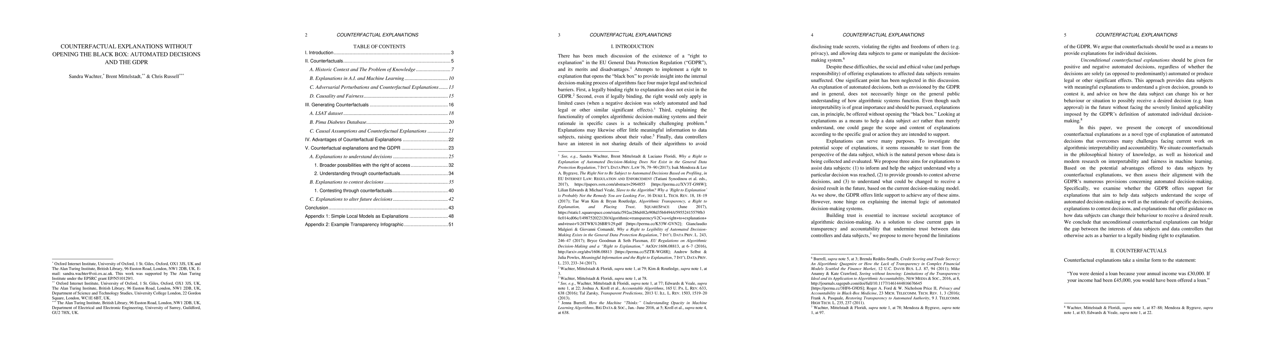 This paper discusses the challenges of providing explanations for automated decisions under GDPR without revealing the internal workings of complex algorithms. It proposes that explanations should focus on informing individuals, enabling contestation of undesired outcomes, and suggesting changes for future desired results, using unconditional counterfactual explanations that describe minimal changes needed for desirable outcomes.