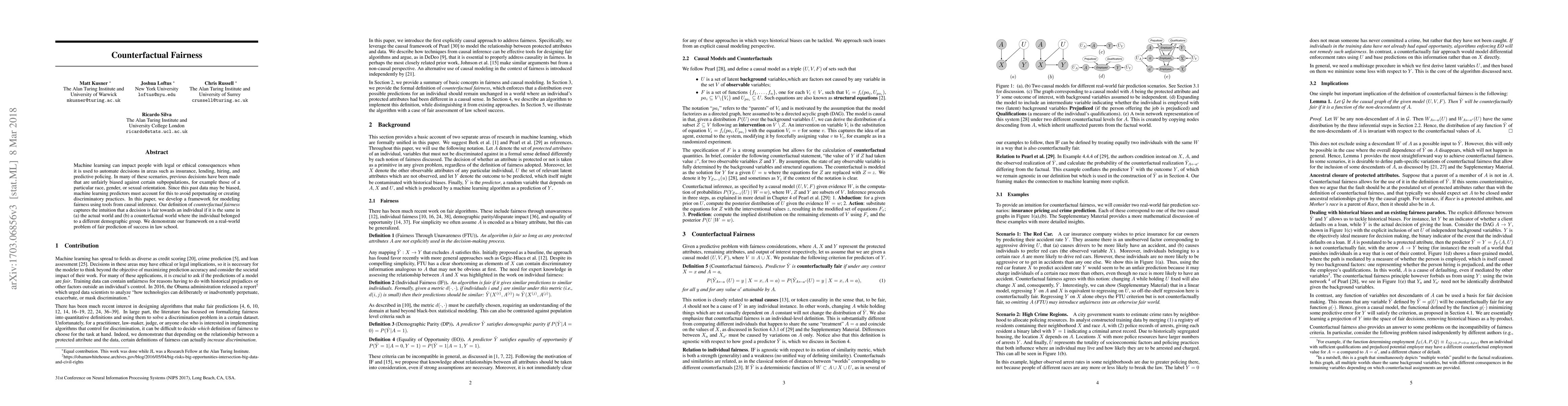 This paper introduces a framework for modeling fairness in machine learning using counterfactual fairness, which ensures decisions remain consistent across demographic groups in both actual and counterfactual scenarios. The authors demonstrate its application in predicting law school success, aiming to mitigate biases in past data.