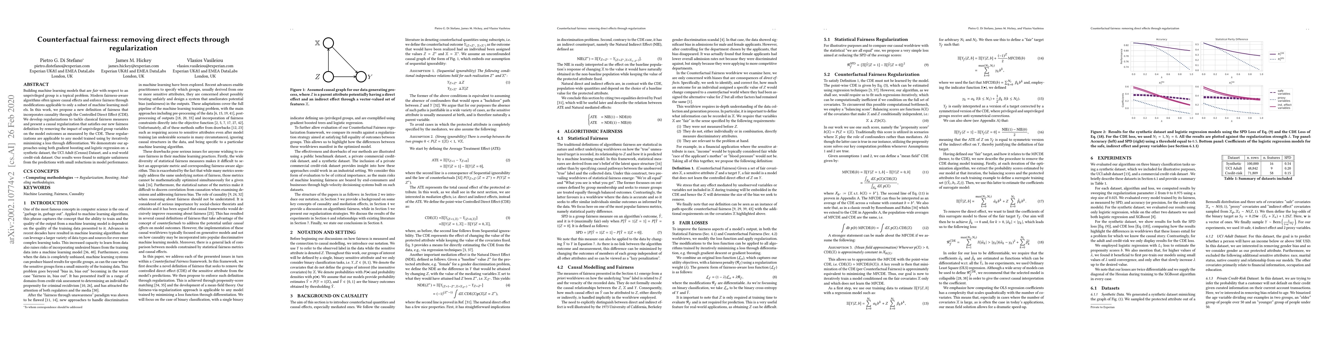 Building machine learning models that are fair with respect to an unprivileged group is a topical problem. Modern fairness-aware algorithms often ignore causal effects and enforce fairness through modifications applicable to only a subset of machine learning models. In this work, we propose a new definition of fairness that incorporates causality through the Controlled Direct Effect (CDE). We develop regularizations to tackle classical fairness measures and present a causal regularization that satisfies our new fairness definition by removing the impact of unprivileged group variables on the model outcomes as measured by the CDE. These regularizations are applicable to any model trained using by iteratively minimizing a loss through differentiation. We demonstrate our approaches using both gradient boosting and logistic regression on: a synthetic dataset, the UCI Adult (Census) Dataset, and a real-world credit-risk dataset. Our results were found to mitigate unfairness from the predictions with small reductions in model performance.