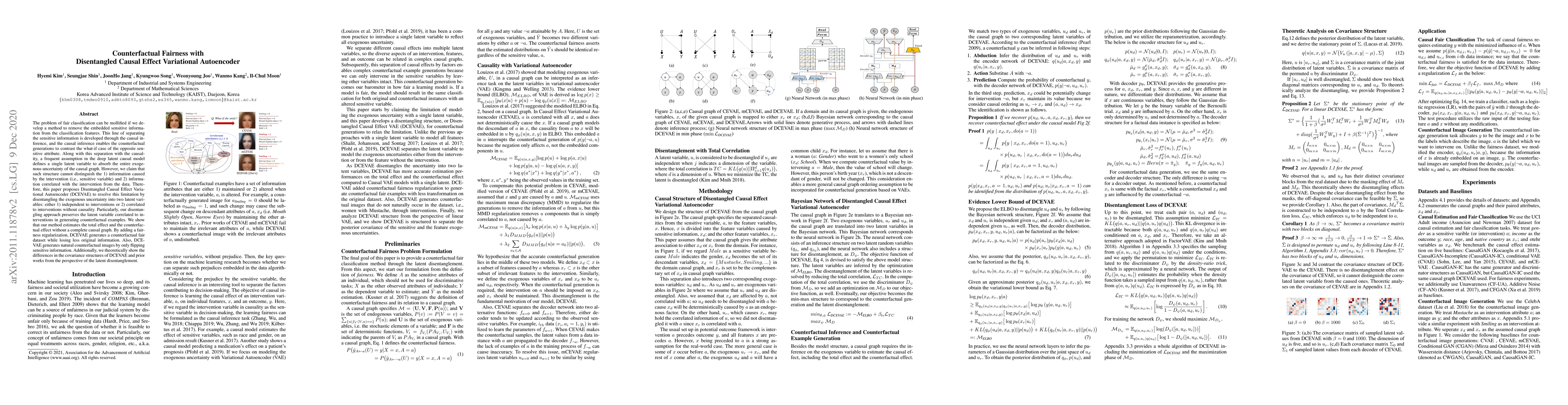 This paper introduces Disentangled Causal Effect Variational Autoencoder (DCEVAE) to disentangle exogenous uncertainty into two latent variables, addressing the limitation of existing models in distinguishing intervention-caused information from correlated information. DCEVAE generates counterfactual examples and fair datasets by preserving sensitive information, showing theoretically different covariance structures compared to prior works.