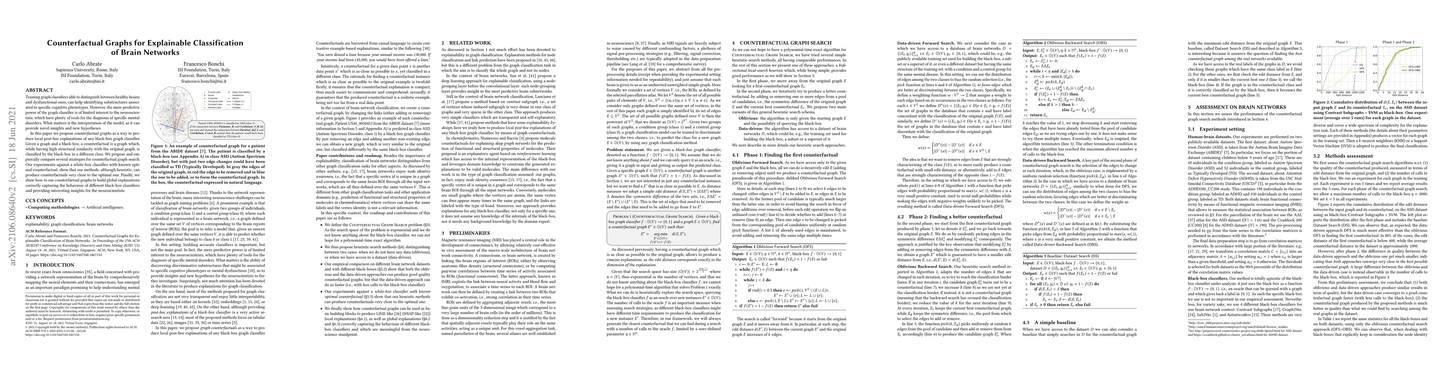 Training graph classifiers able to distinguish between healthy brains and dysfunctional ones, can help identifying substructures associated to specific cognitive phenotypes. However, the mere predictive power of the graph classifier is of limited interest to the neuroscientists, which have plenty of tools for the diagnosis of specific mental disorders. What matters is the interpretation of the model, as it can provide novel insights and new hypotheses. In this paper we propose \emph{counterfactual graphs} as a way to produce local post-hoc explanations of any black-box graph classifier. Given a graph and a black-box, a counterfactual is a graph which, while having high structural similarity with the original graph, is classified by the black-box in a different class. We propose and empirically compare several strategies for counterfactual graph search. Our experiments against a white-box classifier with known optimal counterfactual, show that our methods, although heuristic, can produce counterfactuals very close to the optimal one. Finally, we show how to use counterfactual graphs to build global explanations correctly capturing the behaviour of different black-box classifiers and providing interesting insights for the neuroscientists.