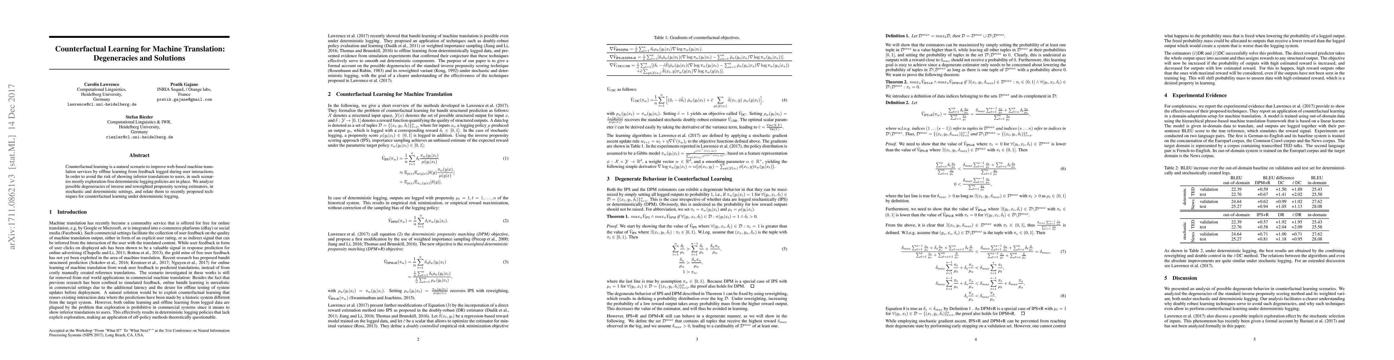 This paper investigates the challenges of counterfactual learning in improving web-based machine translation through offline learning from user interaction logs. It identifies degeneracies in inverse and reweighted propensity scoring estimators and proposes solutions to mitigate these issues in both stochastic and deterministic settings.