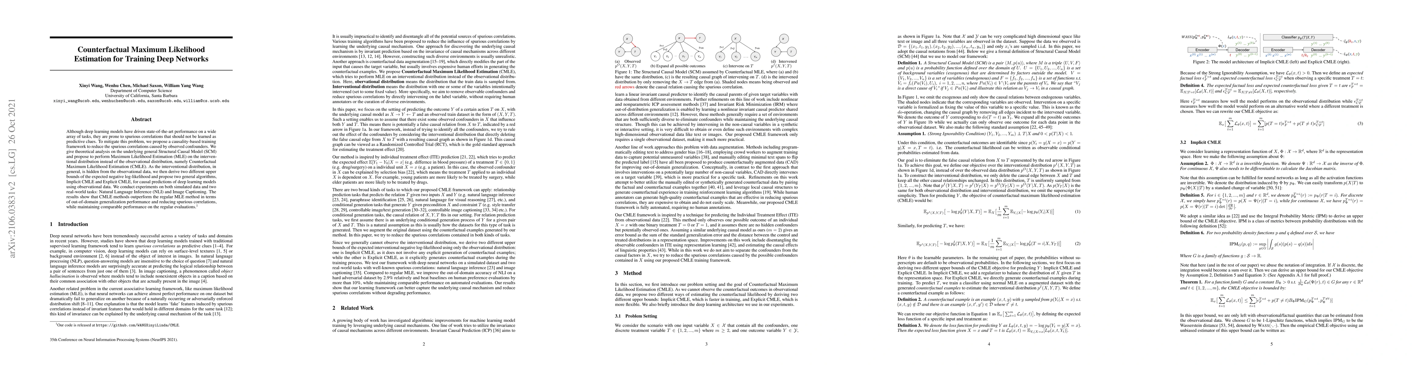 This paper proposes a causality-based training framework called Counterfactual Maximum Likelihood Estimation (CMLE) to reduce spurious correlations in deep learning models. The CMLE method performs MLE on the interventional distribution, achieving better out-of-domain generalization and reducing confounder effects compared to traditional MLE.