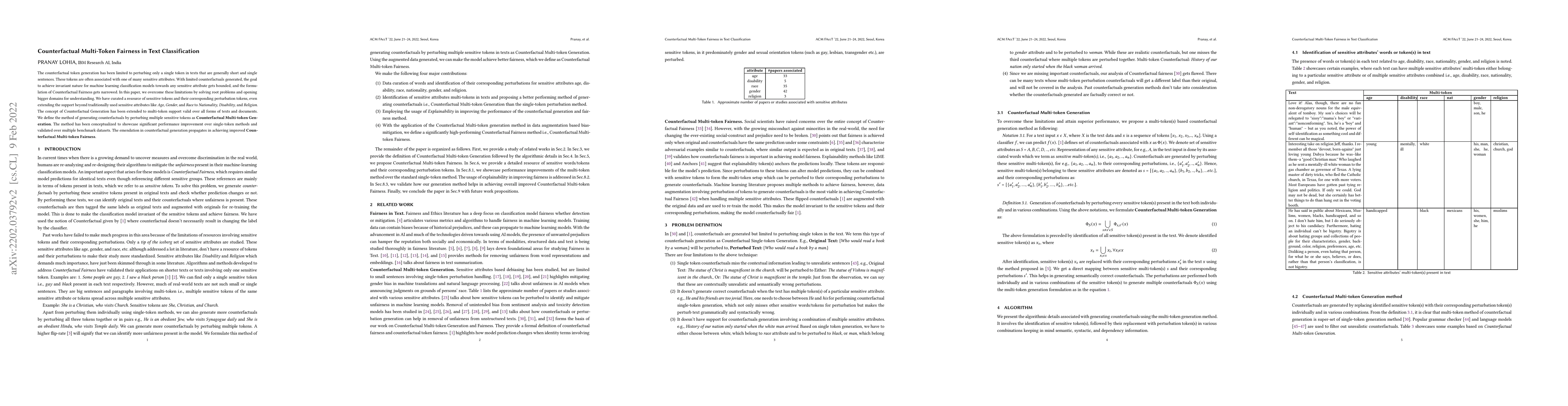 This paper introduces Counterfactual Multi-token Generation, a method to extend counterfactual fairness in text classification by perturbing multiple sensitive tokens, thereby improving fairness and performance over single-token methods across various datasets.
