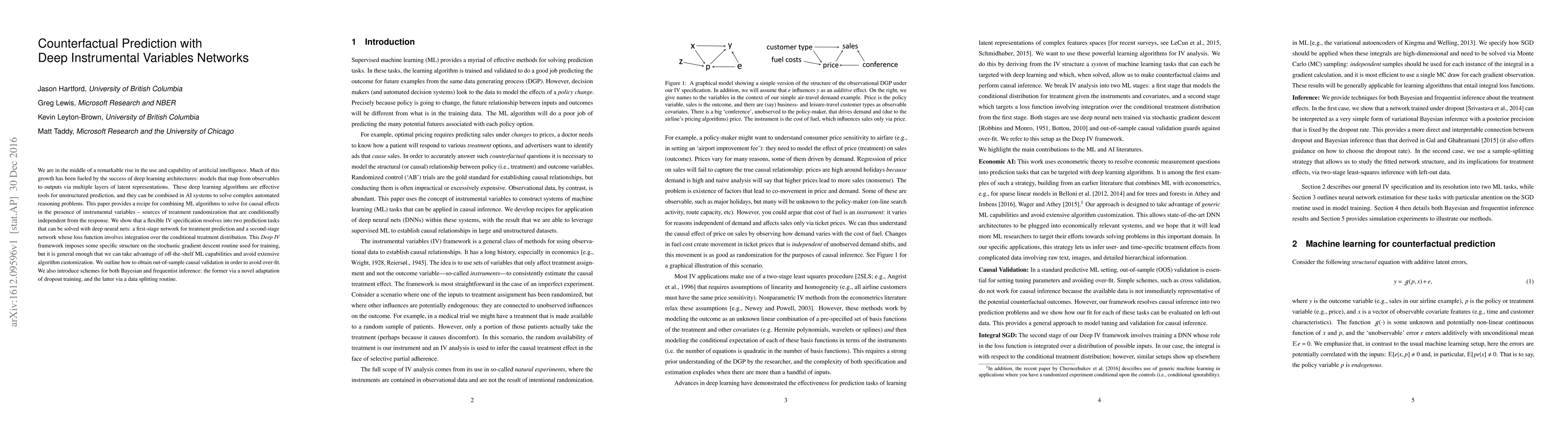 This paper proposes a Deep Instrumental Variables (Deep IV) framework that leverages deep neural networks to estimate causal effects using instrumental variables. It outlines a two-stage approach combining machine learning for treatment prediction and causal inference, with strategies for out-of-sample validation and both Bayesian and frequentist inference.