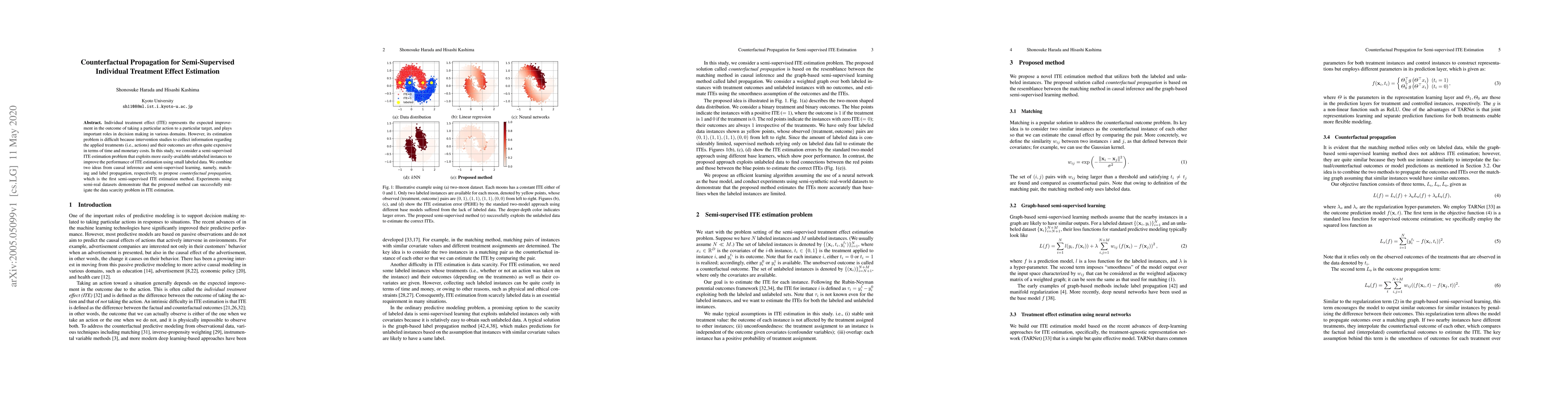 This paper introduces counterfactual propagation to estimate individual treatment effects (ITE) using semi-supervised learning, combining causal inference and matching techniques with label propagation. The method leverages unlabeled data to enhance ITE estimation with limited labeled data, demonstrating improved performance in semi-real experiments.