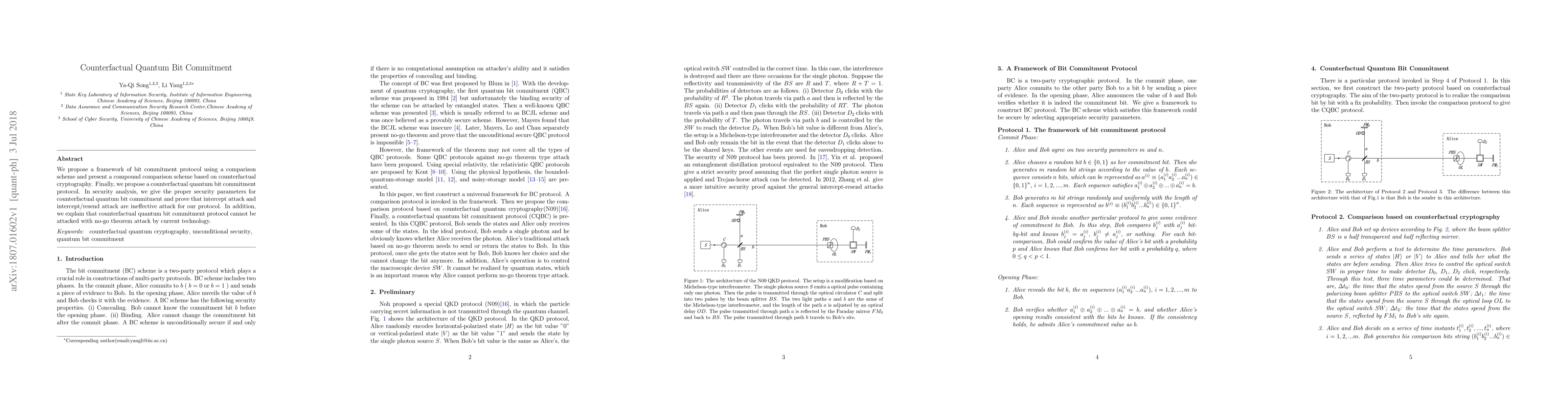 This paper proposes a novel counterfactual quantum bit commitment protocol based on a compound comparison scheme leveraging counterfactual cryptography. The framework is shown to be secure against intercept and resend attacks, and the no-go theorem attack is deemed ineffective by current technology.