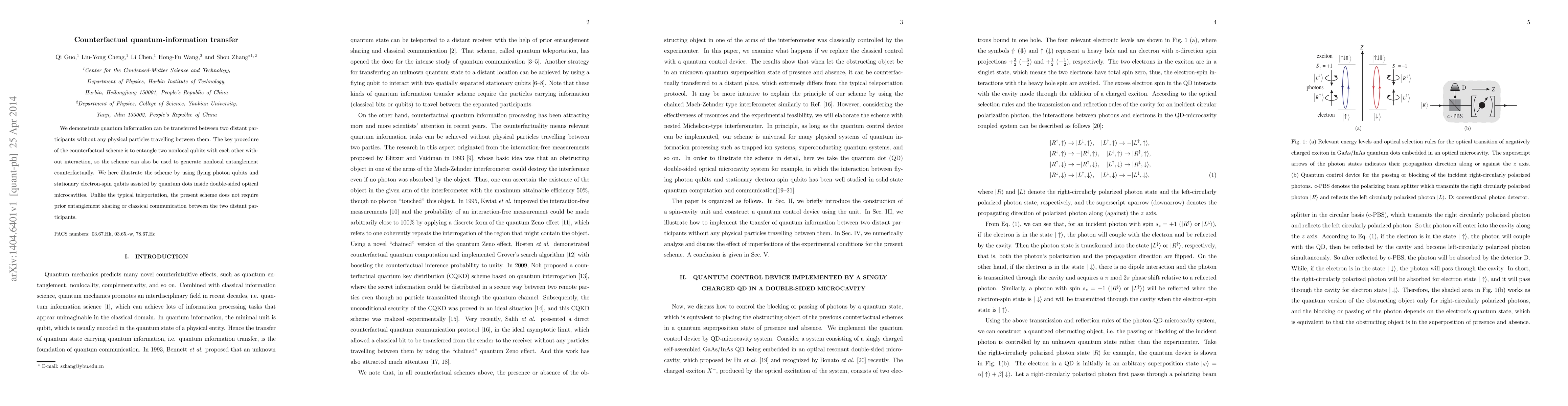 The research demonstrates counterfactual quantum-information transfer using flying photon qubits and stationary electron-spin qubits assisted by double-sided optical microcavities, without requiring prior entanglement sharing or classical communication.