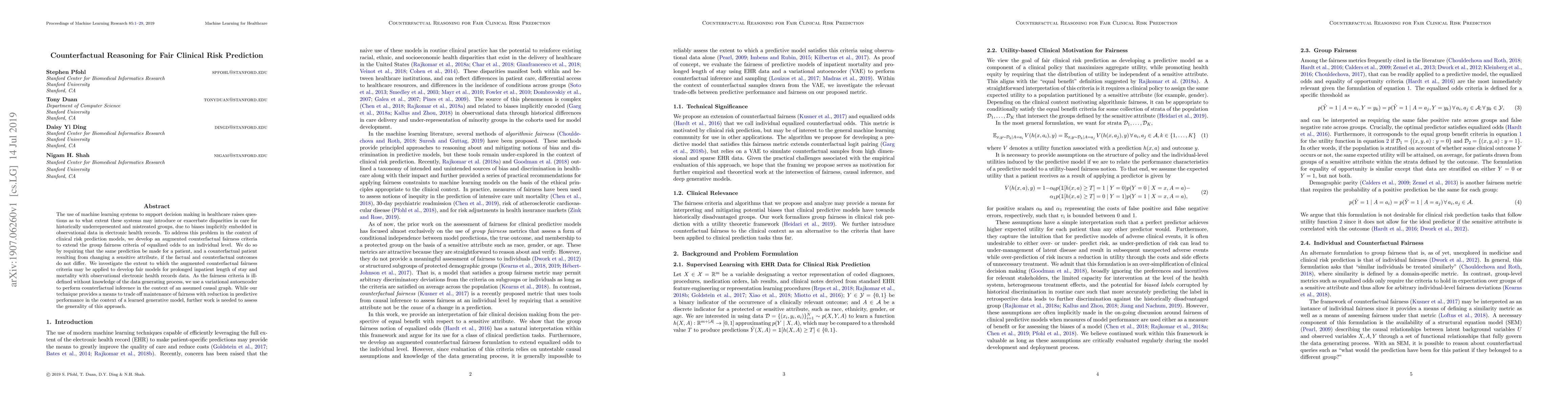 The use of machine learning systems to support decision making in healthcare raises questions as to what extent these systems may introduce or exacerbate disparities in care for historically underrepresented and mistreated groups, due to biases implicitly embedded in observational data in electronic health records. To address this problem in the context of clinical risk prediction models, we develop an augmented counterfactual fairness criteria to extend the group fairness criteria of equalized odds to an individual level. We do so by requiring that the same prediction be made for a patient, and a counterfactual patient resulting from changing a sensitive attribute, if the factual and counterfactual outcomes do not differ. We investigate the extent to which the augmented counterfactual fairness criteria may be applied to develop fair models for prolonged inpatient length of stay and mortality with observational electronic health records data. As the fairness criteria is ill-defined without knowledge of the data generating process, we use a variational autoencoder to perform counterfactual inference in the context of an assumed causal graph. While our technique provides a means to trade off maintenance of fairness with reduction in predictive performance in the context of a learned generative model, further work is needed to assess the generality of this approach.