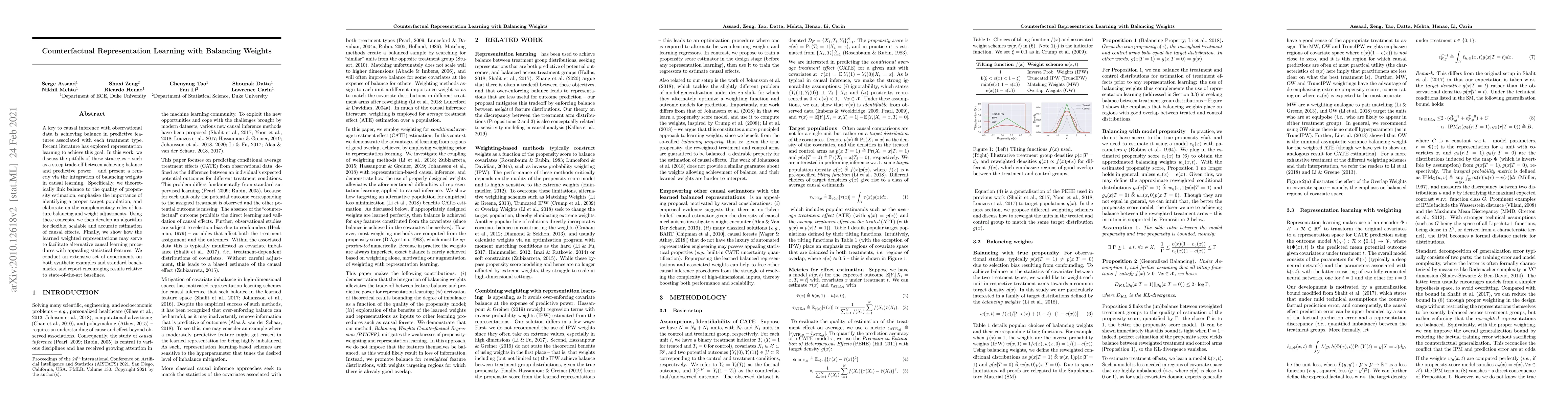 A key to causal inference with observational data is achieving balance in predictive features associated with each treatment type. Recent literature has explored representation learning to achieve this goal. In this work, we discuss the pitfalls of these strategies - such as a steep trade-off between achieving balance and predictive power - and present a remedy via the integration of balancing weights in causal learning. Specifically, we theoretically link balance to the quality of propensity estimation, emphasize the importance of identifying a proper target population, and elaborate on the complementary roles of feature balancing and weight adjustments. Using these concepts, we then develop an algorithm for flexible, scalable and accurate estimation of causal effects. Finally, we show how the learned weighted representations may serve to facilitate alternative causal learning procedures with appealing statistical features. We conduct an extensive set of experiments on both synthetic examples and standard benchmarks, and report encouraging results relative to state-of-the-art baselines.