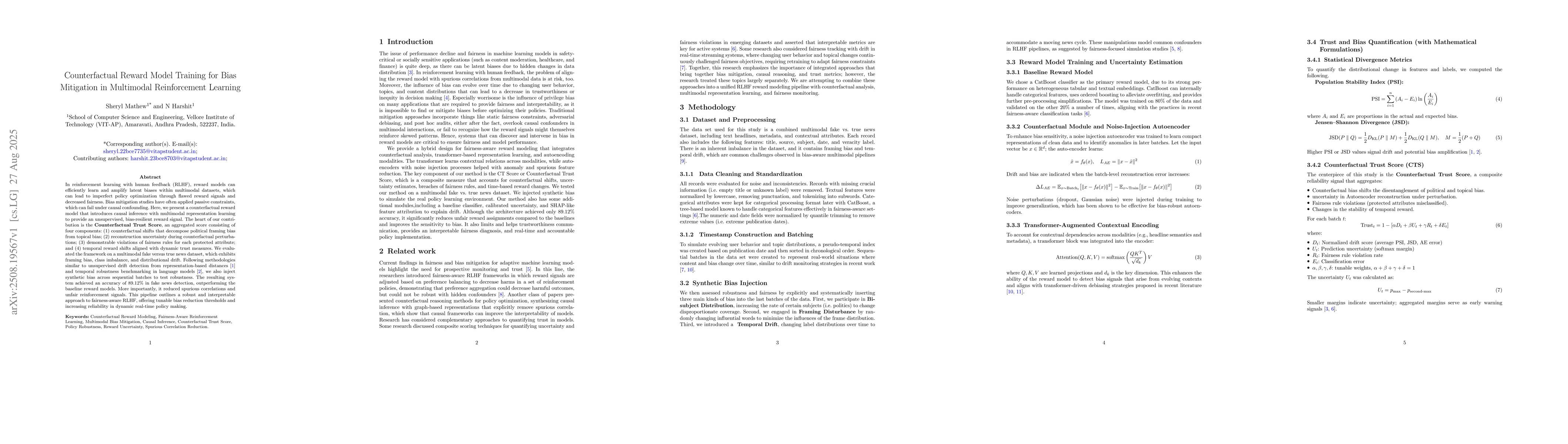 In reinforcement learning with human feedback (RLHF), reward models can efficiently learn and amplify latent biases within multimodal datasets, which can lead to imperfect policy optimization through flawed reward signals and decreased fairness. Bias mitigation studies have often applied passive constraints, which can fail under causal confounding. Here, we present a counterfactual reward model that introduces causal inference with multimodal representation learning to provide an unsupervised, bias-resilient reward signal. The heart of our contribution is the Counterfactual Trust Score, an aggregated score consisting of four components: (1) counterfactual shifts that decompose political framing bias from topical bias; (2) reconstruction uncertainty during counterfactual perturbations; (3) demonstrable violations of fairness rules for each protected attribute; and (4) temporal reward shifts aligned with dynamic trust measures. We evaluated the framework on a multimodal fake versus true news dataset, which exhibits framing bias, class imbalance, and distributional drift. Following methodologies similar to unsupervised drift detection from representation-based distances [1] and temporal robustness benchmarking in language models [2], we also inject synthetic bias across sequential batches to test robustness. The resulting system achieved an accuracy of 89.12% in fake news detection, outperforming the baseline reward models. More importantly, it reduced spurious correlations and unfair reinforcement signals. This pipeline outlines a robust and interpretable approach to fairness-aware RLHF, offering tunable bias reduction thresholds and increasing reliability in dynamic real-time policy making.