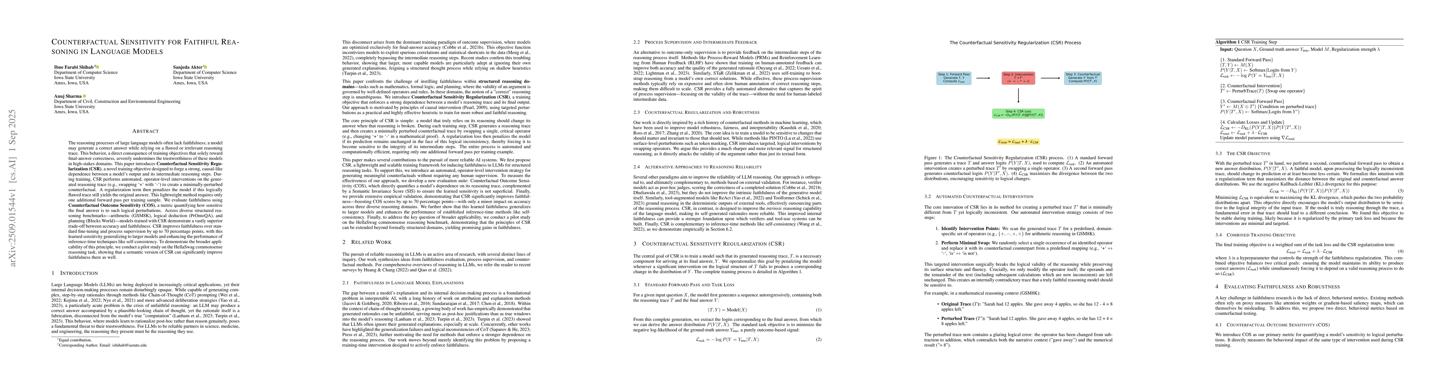 Large language models (LLMs) often produce correct answers while relying on flawed or irrelevant reasoning traces, undermining their trustworthiness in high-stakes domains. We propose Counterfactual Sensitivity Regularization (CSR), a lightweight training objective that enforces dependence between intermediate reasoning and final outputs. CSR introduces automated, operator-level counterfactual interventions (e.g., swapping "+" with "-") during training and penalizes models that preserve the same answer under logically invalid traces. This requires only one additional forward pass per sample. To measure faithfulness, we introduce Counterfactual Outcome Sensitivity (COS), which quantifies the impact of such perturbations on model predictions. Across structured reasoning tasks - arithmetic (GSM8K), logical deduction (PrOntoQA), and planning (Blocks World) - CSR improves faithfulness by up to 70 percentage points over standard fine-tuning and process supervision, with only minor accuracy loss. The learned sensitivity generalizes to larger models and synergizes with inference-time methods such as self-consistency. A pilot study on HellaSwag further demonstrates that extending CSR with semantic perturbations can enhance faithfulness in commonsense reasoning.
