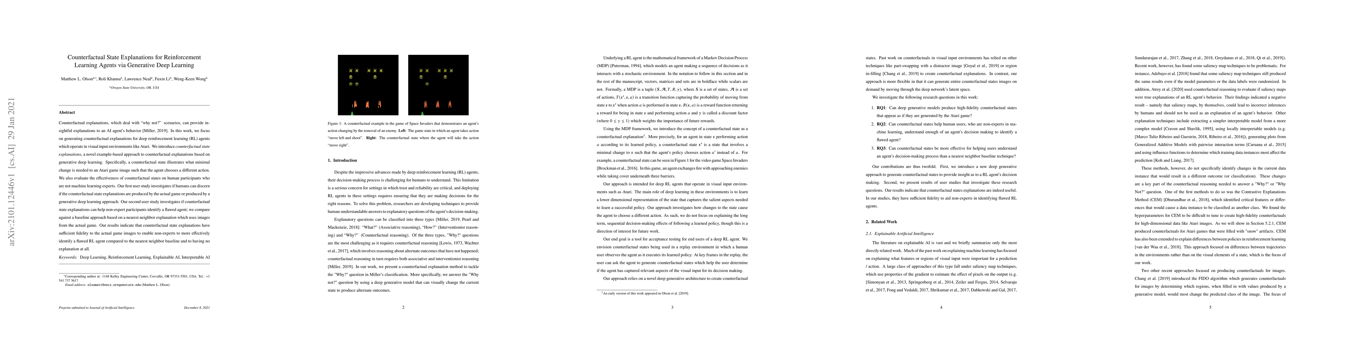This paper introduces counterfactual state explanations for deep reinforcement learning agents, using generative deep learning to illustrate minimal changes in Atari game images that would alter the agent's actions. User studies show that these explanations help non-expert participants identify flawed agents more effectively than baseline methods.