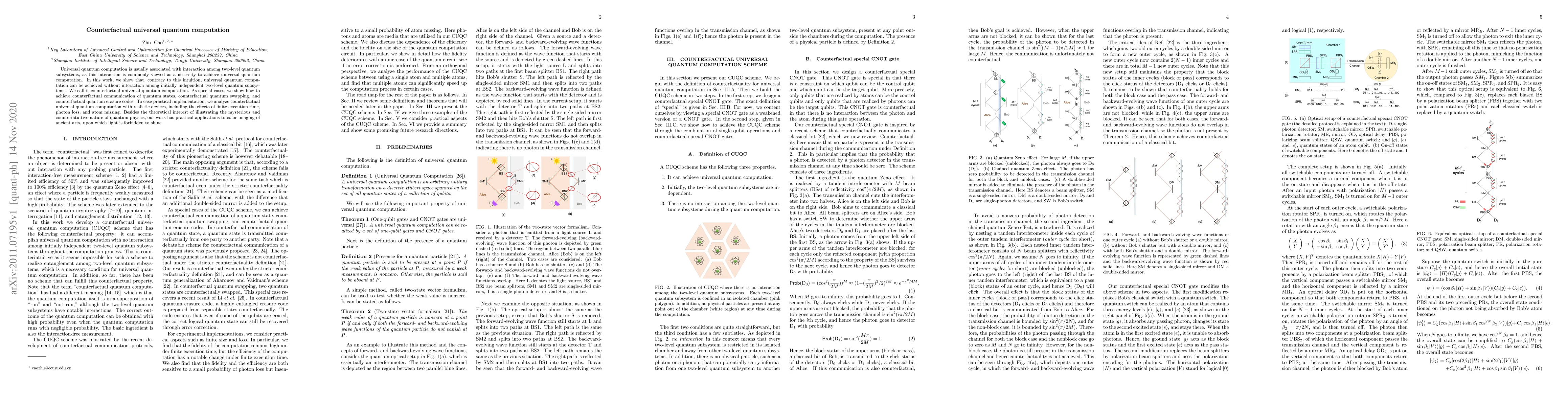 This paper demonstrates that universal quantum computation can be achieved without interaction among initially independent two-level quantum subsystems, termed counterfactual universal quantum computation. It explores practical implications, including realistic device limitations, and suggests applications in imaging ancient artifacts where light exposure is prohibited.