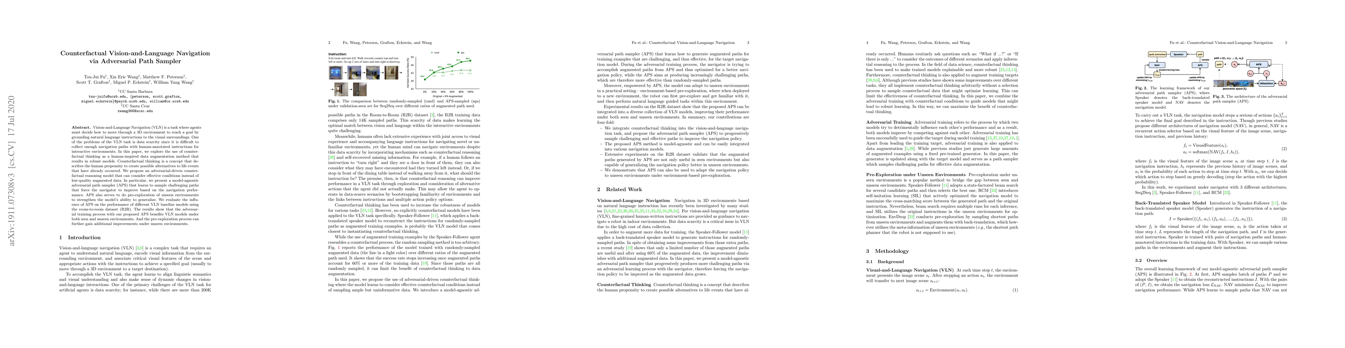 This paper proposes a counterfactual reasoning model using adversarial path sampling to augment data for Vision-and-Language Navigation (VLN) tasks, addressing data scarcity issues. The adversarial path sampler (APS) enhances model robustness and generalization by exploring challenging navigation paths and unseen environments.