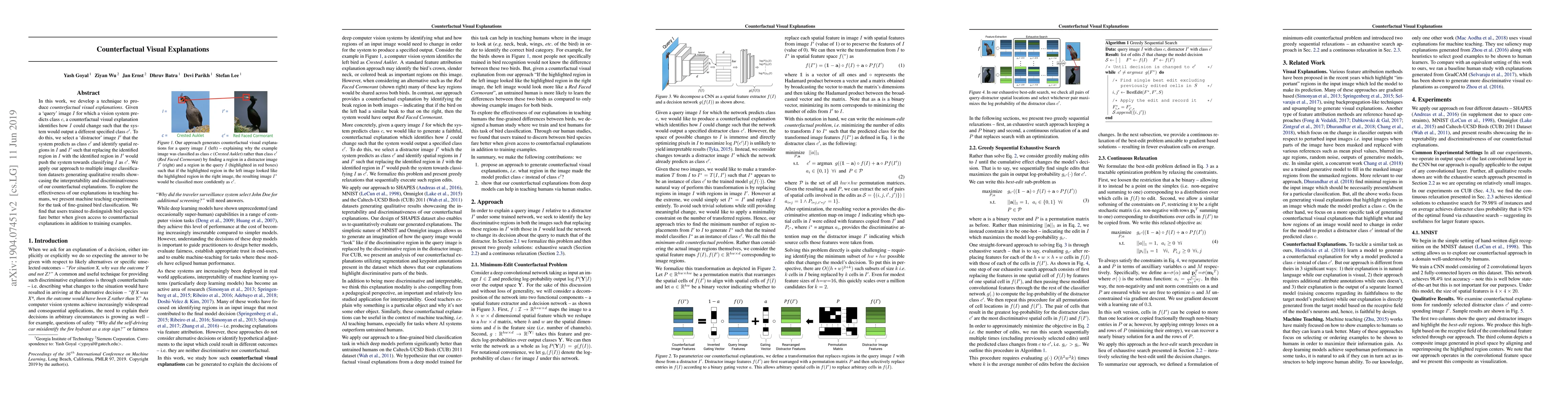This paper introduces a method for generating counterfactual visual explanations to interpret image classification predictions, showing how an image could change to alter the system's predicted class. The technique is demonstrated to improve human learning in fine-grained bird classification tasks.