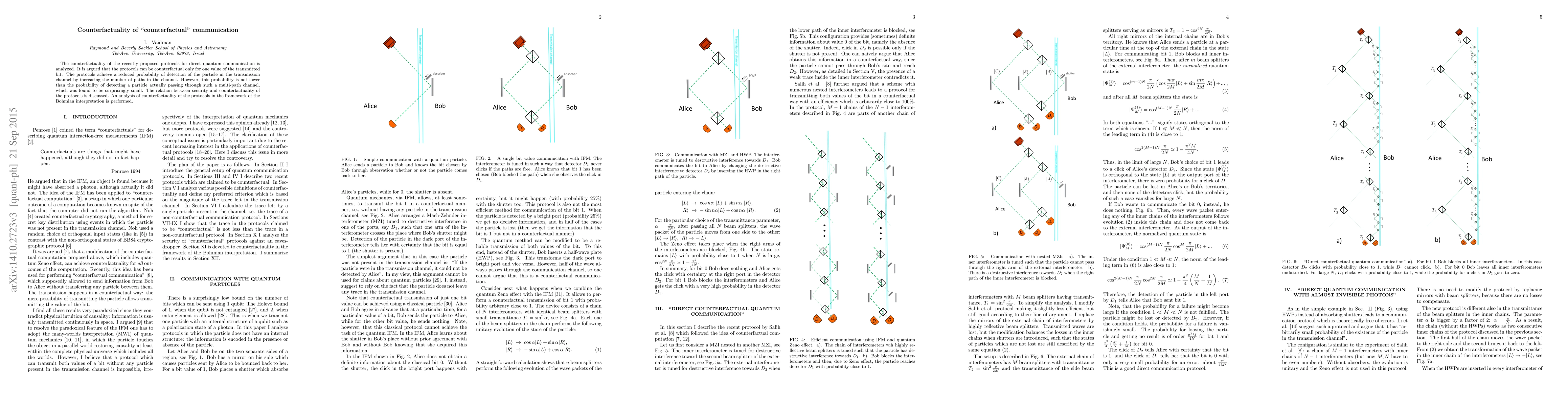 This paper analyzes the counterfactuality of new quantum communication protocols, finding they are only counterfactual for one bit value. The protocols reduce detection probability by using multiple paths, but this probability remains comparable to that of a multi-path channel, highlighting the nuanced relationship between security and counterfactuality, especially under the Bohmian interpretation.