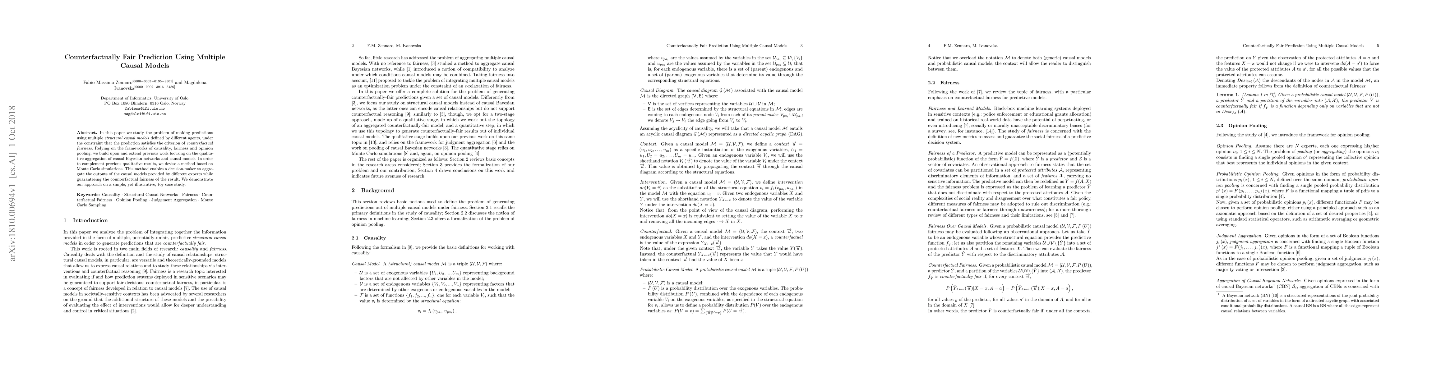 This paper proposes a method for aggregating predictions from multiple causal models while ensuring counterfactual fairness, using Monte Carlo simulations to integrate expert outputs. The approach is demonstrated through a simple case study.