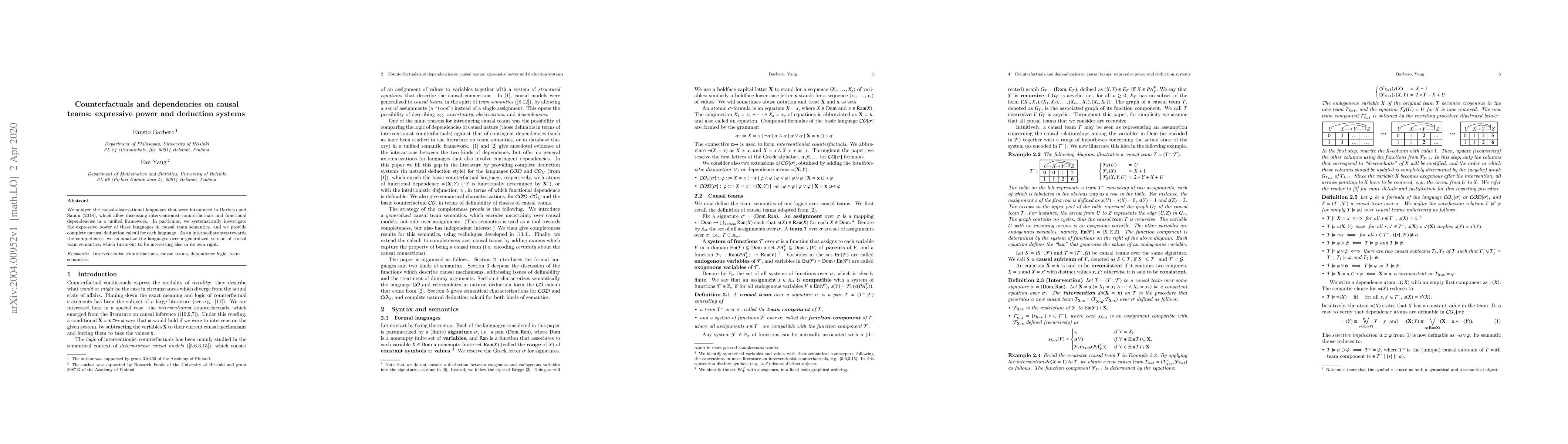 This paper investigates the expressive power of causal-observational languages introduced in Barbero and Sandu (2018) for discussing interventionist counterfactuals and functional dependencies, and provides complete natural deduction calculi. It also axiomatizes these languages over a generalized version of causal team semantics.