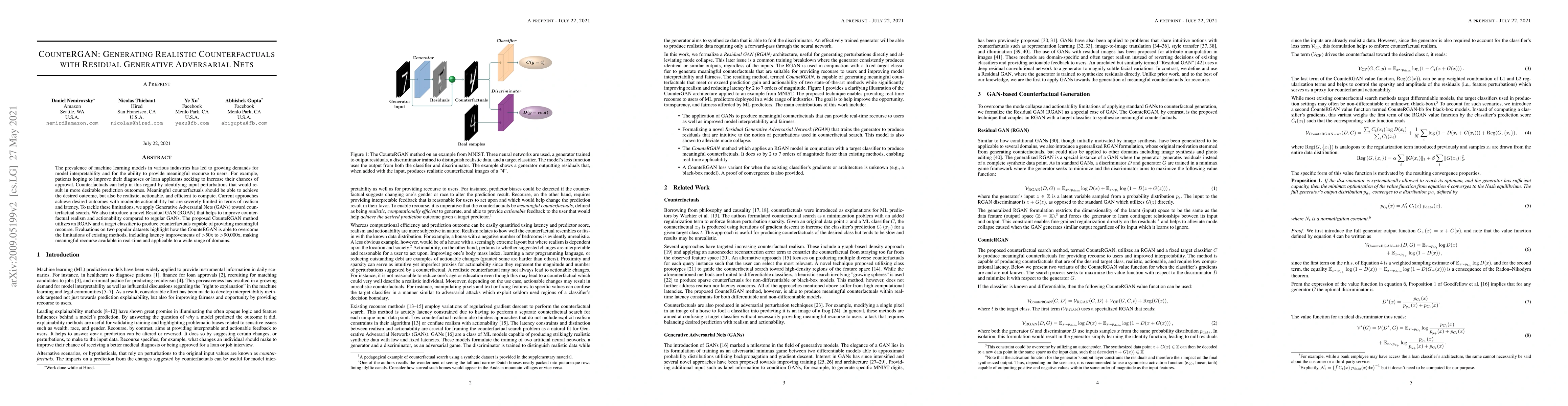 The prevalence of machine learning models in various industries has led to growing demands for model interpretability and for the ability to provide meaningful recourse to users. For example, patients hoping to improve their diagnoses or loan applicants seeking to increase their chances of approval. Counterfactuals can help in this regard by identifying input perturbations that would result in more desirable prediction outcomes. Meaningful counterfactuals should be able to achieve the desired outcome, but also be realistic, actionable, and efficient to compute. Current approaches achieve desired outcomes with moderate actionability but are severely limited in terms of realism and latency. To tackle these limitations, we apply Generative Adversarial Nets (GANs) toward counterfactual search. We also introduce a novel Residual GAN (RGAN) that helps to improve counterfactual realism and actionability compared to regular GANs. The proposed CounteRGAN method utilizes an RGAN and a target classifier to produce counterfactuals capable of providing meaningful recourse. Evaluations on two popular datasets highlight how the CounteRGAN is able to overcome the limitations of existing methods, including latency improvements of >50x to >90,000x, making meaningful recourse available in real-time and applicable to a wide range of domains.