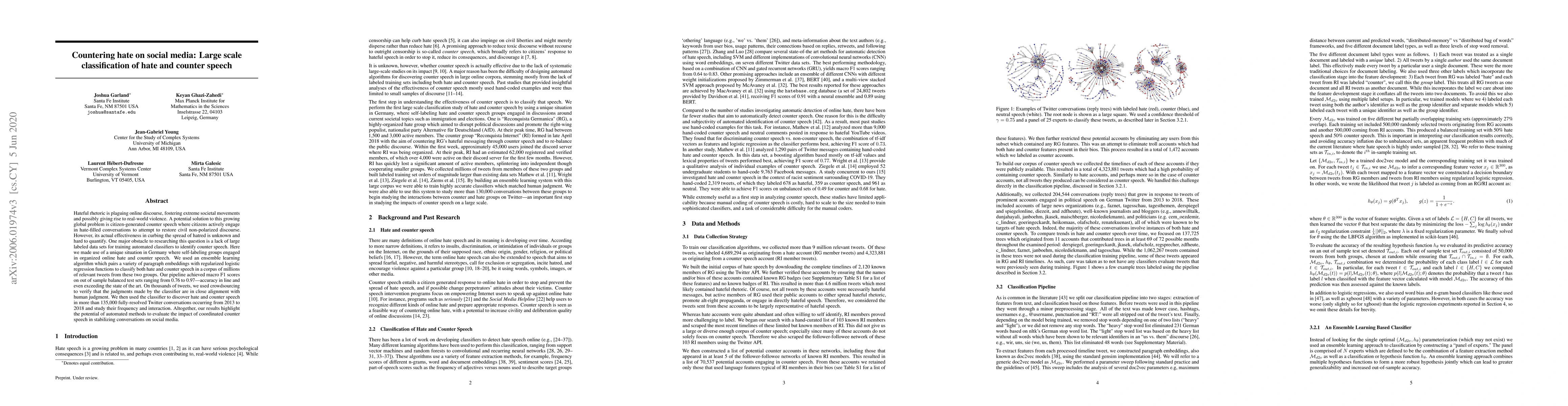 This paper develops an ensemble learning algorithm to classify hate and counter speech in social media, achieving high accuracy. It analyzes over 135,000 Twitter conversations to study the frequency and interaction of these speech types, revealing the potential of automated methods to assess the impact of counter speech on online discourse.