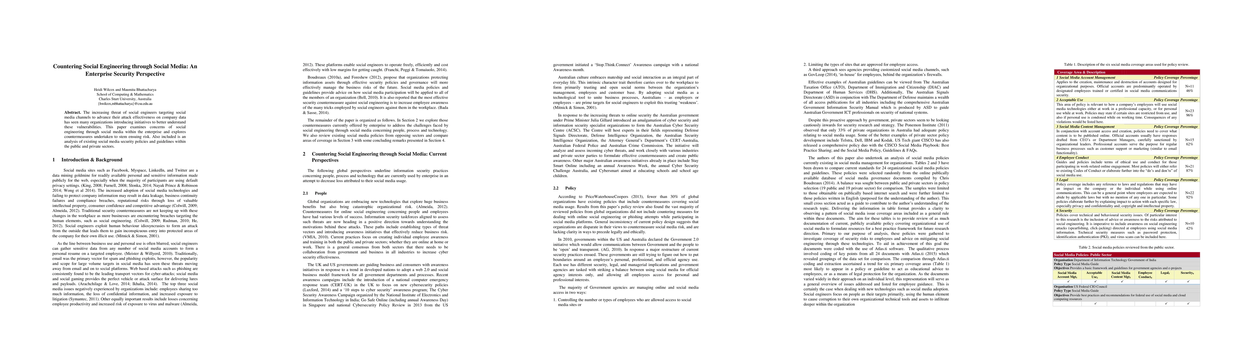 This paper investigates the growing threat of social engineering via social media and the enterprise security measures adopted to mitigate these risks, alongside an analysis of current social media security policies in both public and private sectors.