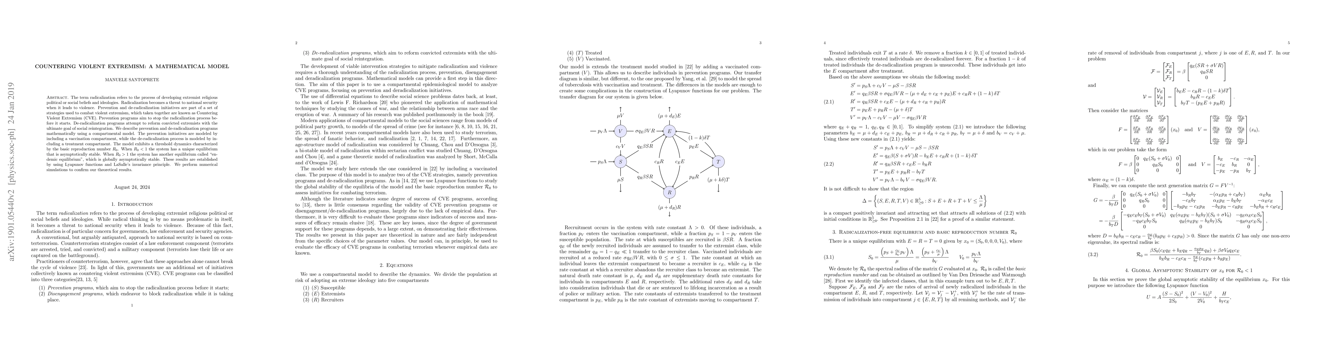 The term radicalization refers to the process of developing extremist religious political or social beliefs and ideologies. Radicalization becomes a threat to national security when it leads to violence. Prevention and de-radicalization initiatives are part of a set of strategies used to combat violent extremism, which taken together are known as Countering Violent Extremism (CVE). Prevention programs aim to stop the radicalization process before it starts. De-radicalization programs attempt to reform convicted extremists with the ultimate goal of social reintegration. We describe prevention and de-radicalization programs mathematically using a compartmental model. The prevention initiatives are modeled by including a vaccination compartment, while the de-radicalization process is modeled by including a treatment compartment. The model exhibits a threshold dynamics characterized by the basic reproduction number $ R _0 $. When $ R _0< 1 $ the system has a unique equilibrium that is asymptotically stable. When $ R _0 >1 $ the system has another equilibrium called "endemic equilibrium", which is globally asymptotically stable. These results are established by using Lyapunov functions and LaSalle's invariance principle. We perform numerical simulations to confirm our theoretical results.