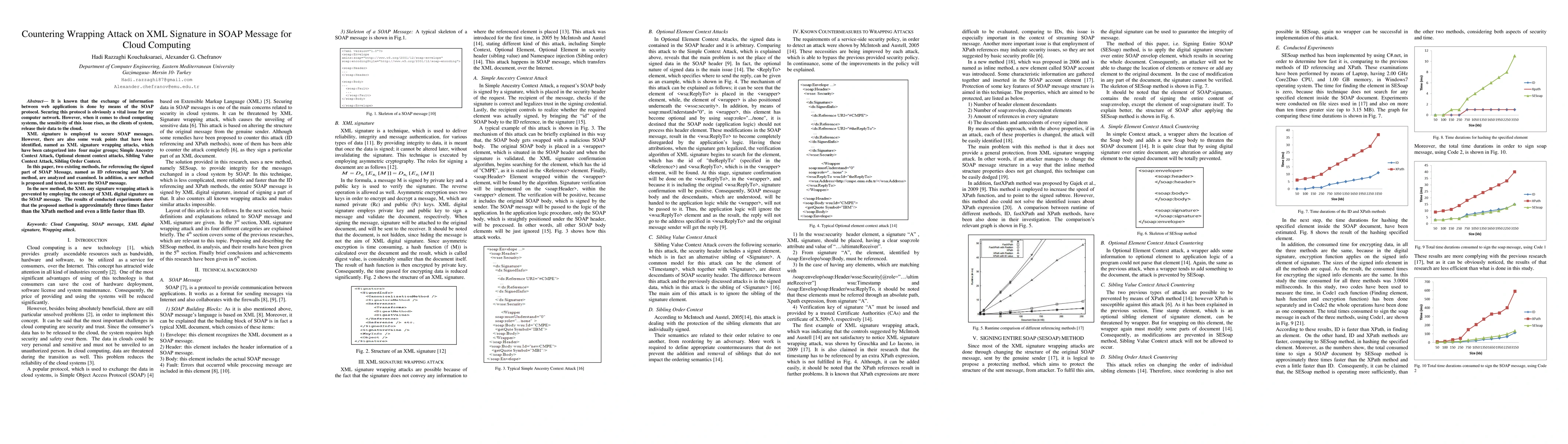 This paper examines vulnerabilities in XML signature wrapping attacks within SOAP messages used in cloud computing, proposing a new method that leverages XML digital signatures to enhance security. The new method is shown to be faster than existing ID referencing and XPath methods.
