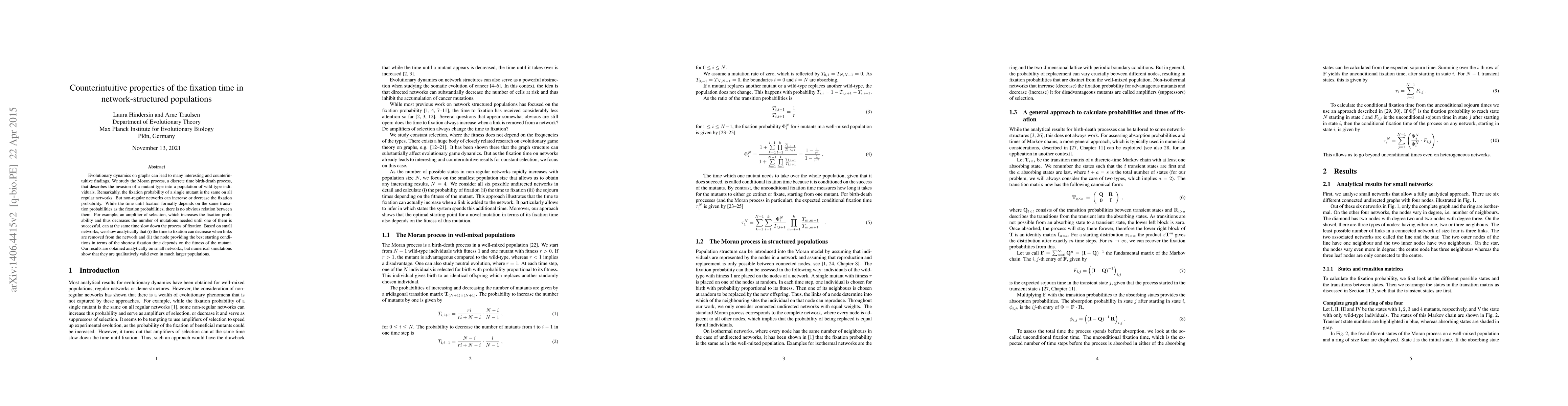 This paper investigates the Moran process on network-structured populations to reveal counterintuitive properties of fixation time. It finds that while the fixation probability remains constant on regular networks, non-regular networks can alter it. Notably, removing links can decrease fixation time, and the best starting node for the shortest fixation time depends on the mutant's fitness, contrary to intuitive expectations.