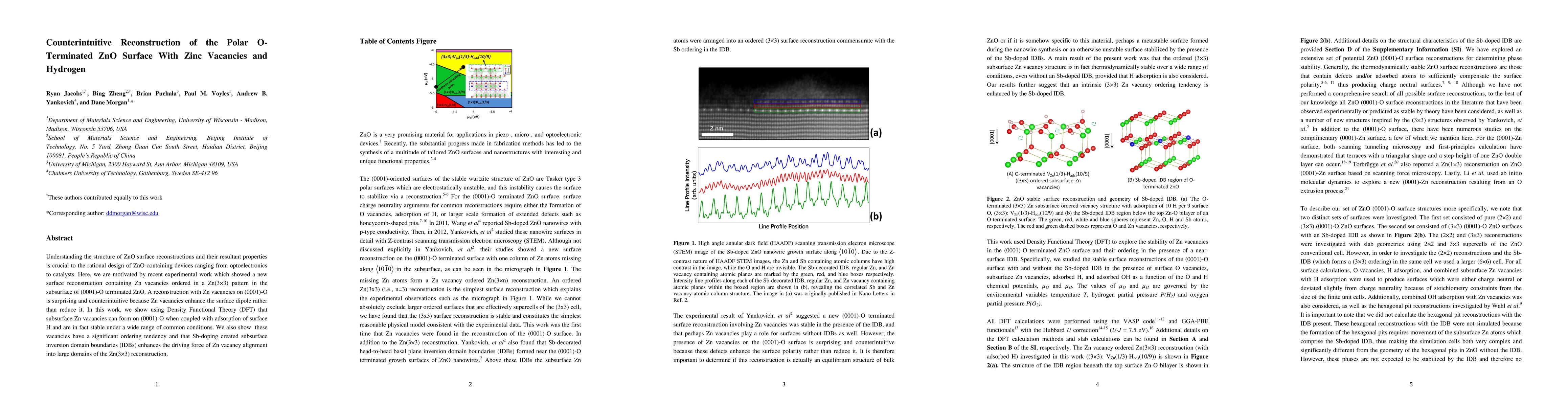 This research reveals a counterintuitive reconstruction of the polar O-terminated ZnO surface featuring subsurface Zn vacancies and hydrogen adsorption, demonstrated to be stable via Density Functional Theory. The presence of Zn vacancies surprisingly enhances the surface dipole, and Sb-doping promotes the formation of large Zn(3x3) reconstruction domains.