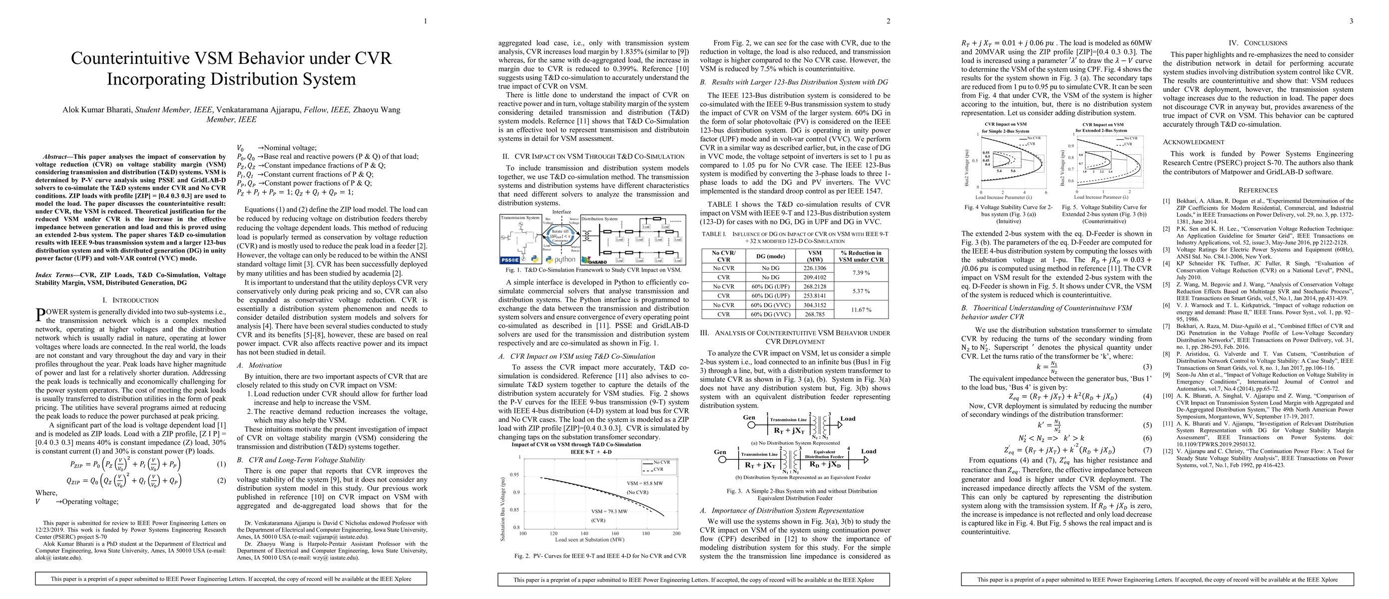 This paper analyses the impact of conservation by voltage reduction (CVR) on voltage stability margin (VSM) considering transmission and distribution (T&D) systems. VSM is determined by P-V curve analysis using PSSE and GridLAB-D solvers to co-simulate the T&D systems under CVR and No CVR conditions. ZIP loads with profile [ZIP] = [0.4 0.3 0.3] are used to model the load. The paper discusses the counterintuitive result: under CVR, the VSM is reduced. Theoretical justification for the reduced VSM under CVR is the increase in the effective impedance between generation and load and this is proved using an extended 2-bus system. The paper shares T&D co-simulation results with IEEE 9-bus transmission system and a larger 123-bus distribution system and with distributed generation (DG) in unity power factor (UPF) and volt-VAR control (VVC) mode.