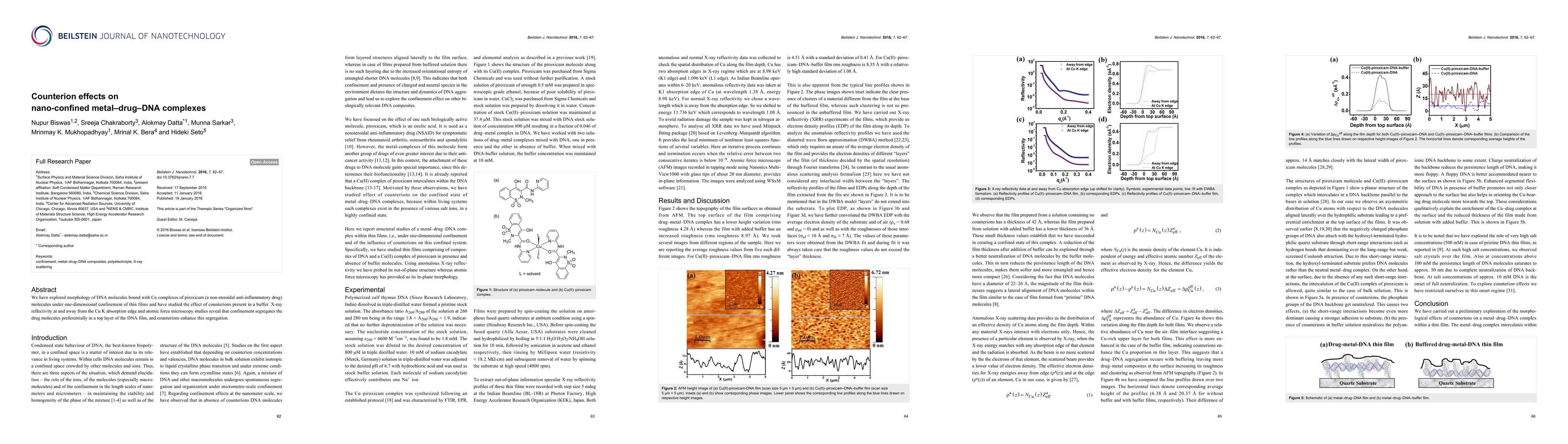 We have explored morphology of DNA molecules bound with Cu-complexes of piroxicam molecules, a non-steroidal anti-inflammatory drug (NSAID), under one-dimensional confinement of thin films and have studied the effect of counterions present in a buffer. X-ray reflectivity at and away from the Cu K absorption edge and atomic force microscopy studies reveal that confinement segregates the drug molecules preferentially in a top layer of the DNA film, and counterions enhance this segregation.