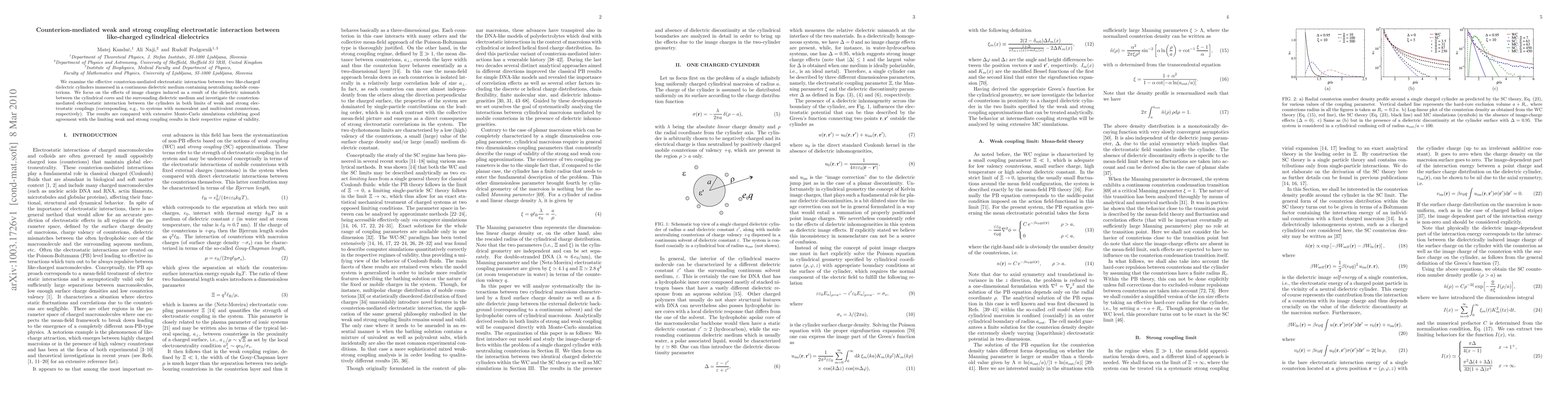 This paper investigates the counterion-mediated electrostatic interactions between like-charged dielectric cylinders, considering both weak and strong coupling scenarios, and validates theoretical models with Monte-Carlo simulations. The study highlights the role of image charges due to dielectric mismatch in determining these interactions.