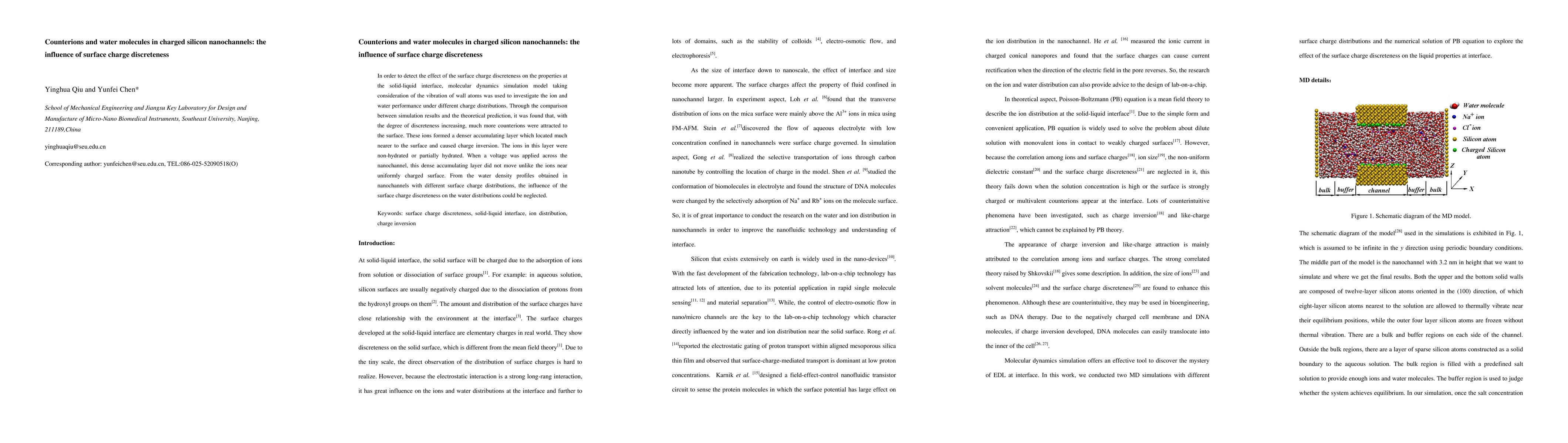 This paper uses molecular dynamics simulations to study how surface charge discreteness affects ions and water in silicon nanochannels. Results show that increased discreteness attracts more counterions, forming a dense, immobile layer near the surface that causes charge inversion, while water distribution remains largely unaffected.