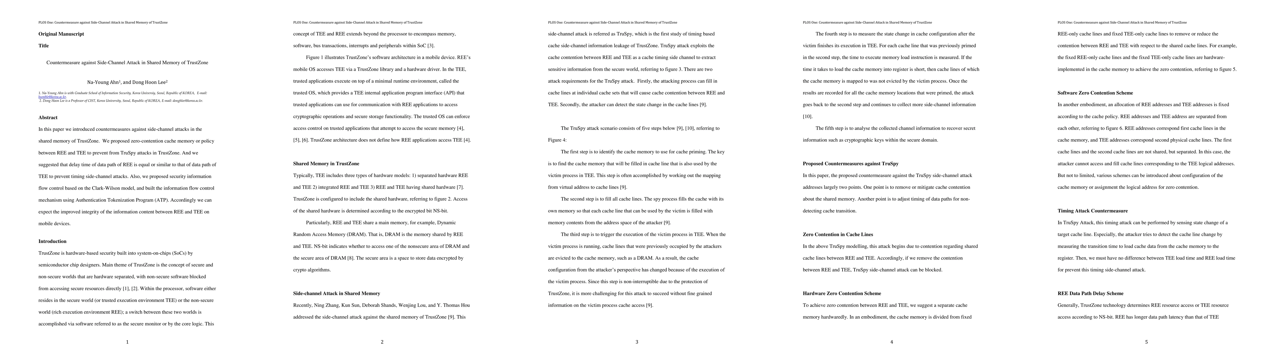 This paper proposes countermeasures to mitigate side-channel attacks in TrustZone's shared memory, including zero-contention cache policies and timing synchronization between REE and TEE to thwart TruSpy attacks. Additionally, it introduces security information flow control based on the Clark-Wilson model and Authentication Tokenization Program (ATP) to enhance data integrity between REE and TEE on mobile devices.