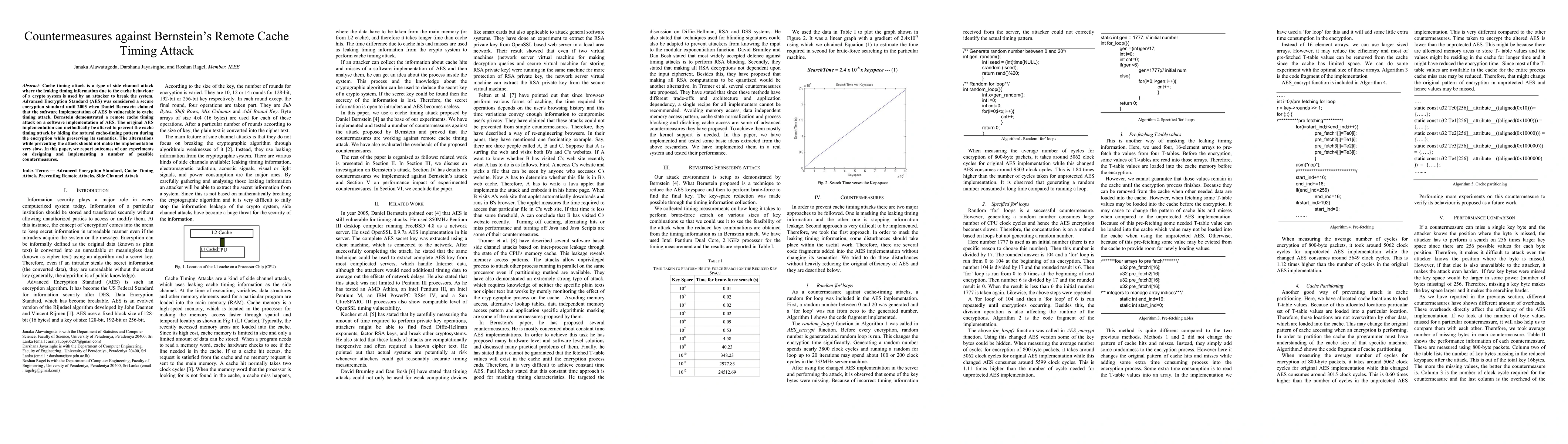 This paper investigates countermeasures against Bernstein's remote cache timing attack on AES, demonstrating effective methods to obscure cache-timing patterns without significantly slowing down the encryption process. Experimental results show promising outcomes in enhancing the security of AES implementations against such timing attacks.